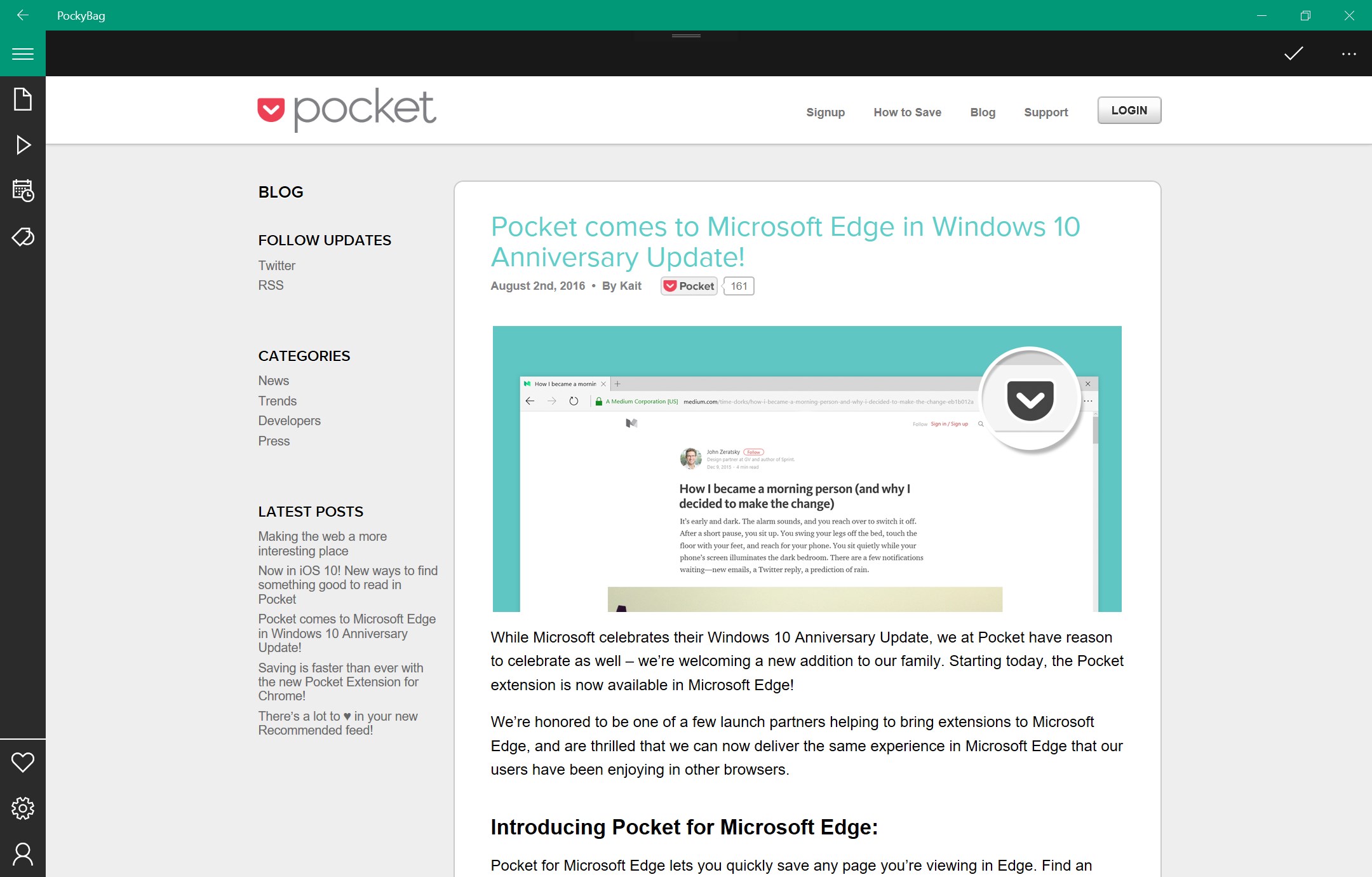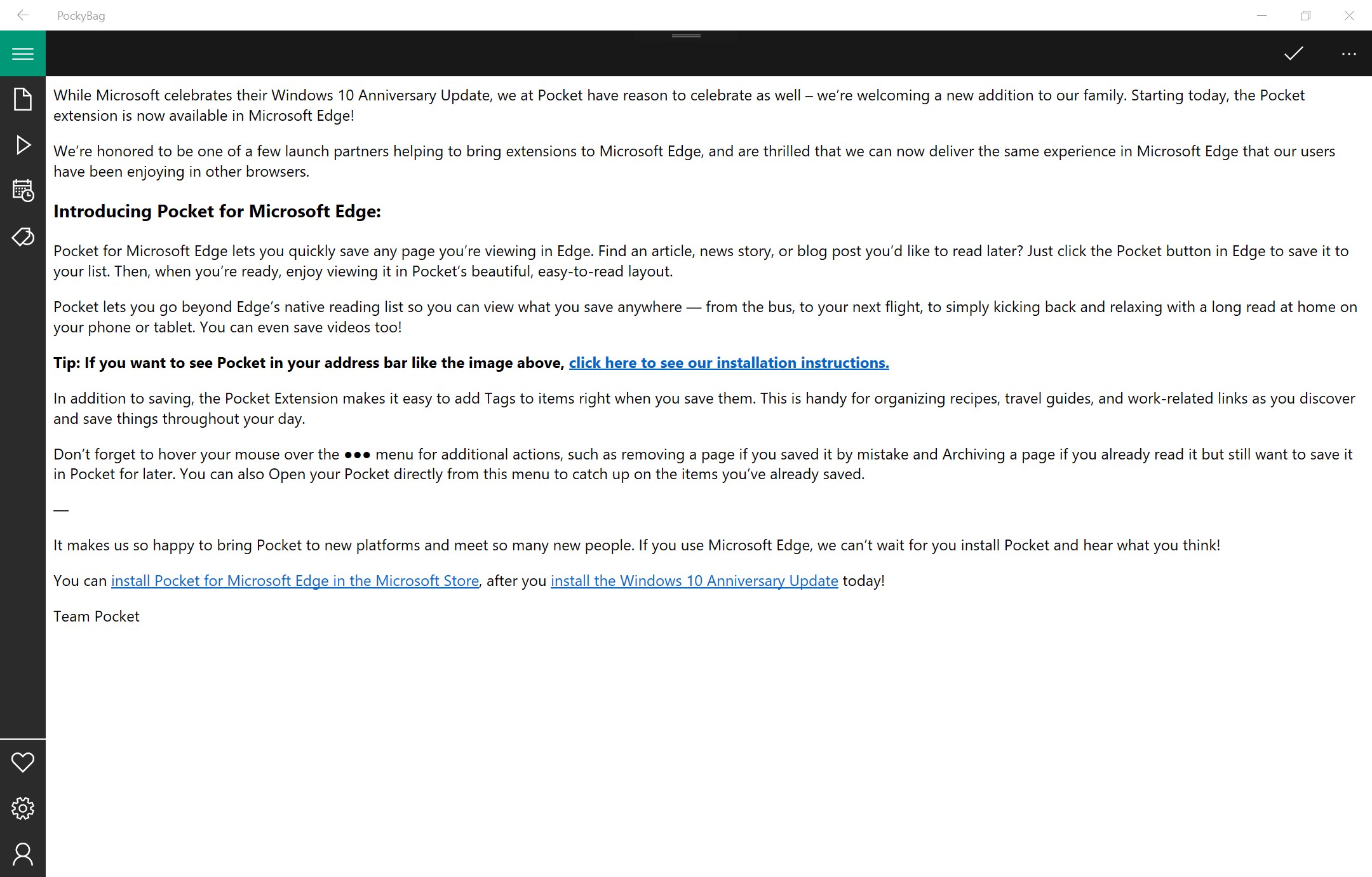 With PockyBag you can envoy Pocket on your Windows devices, PC, tablets or phone.