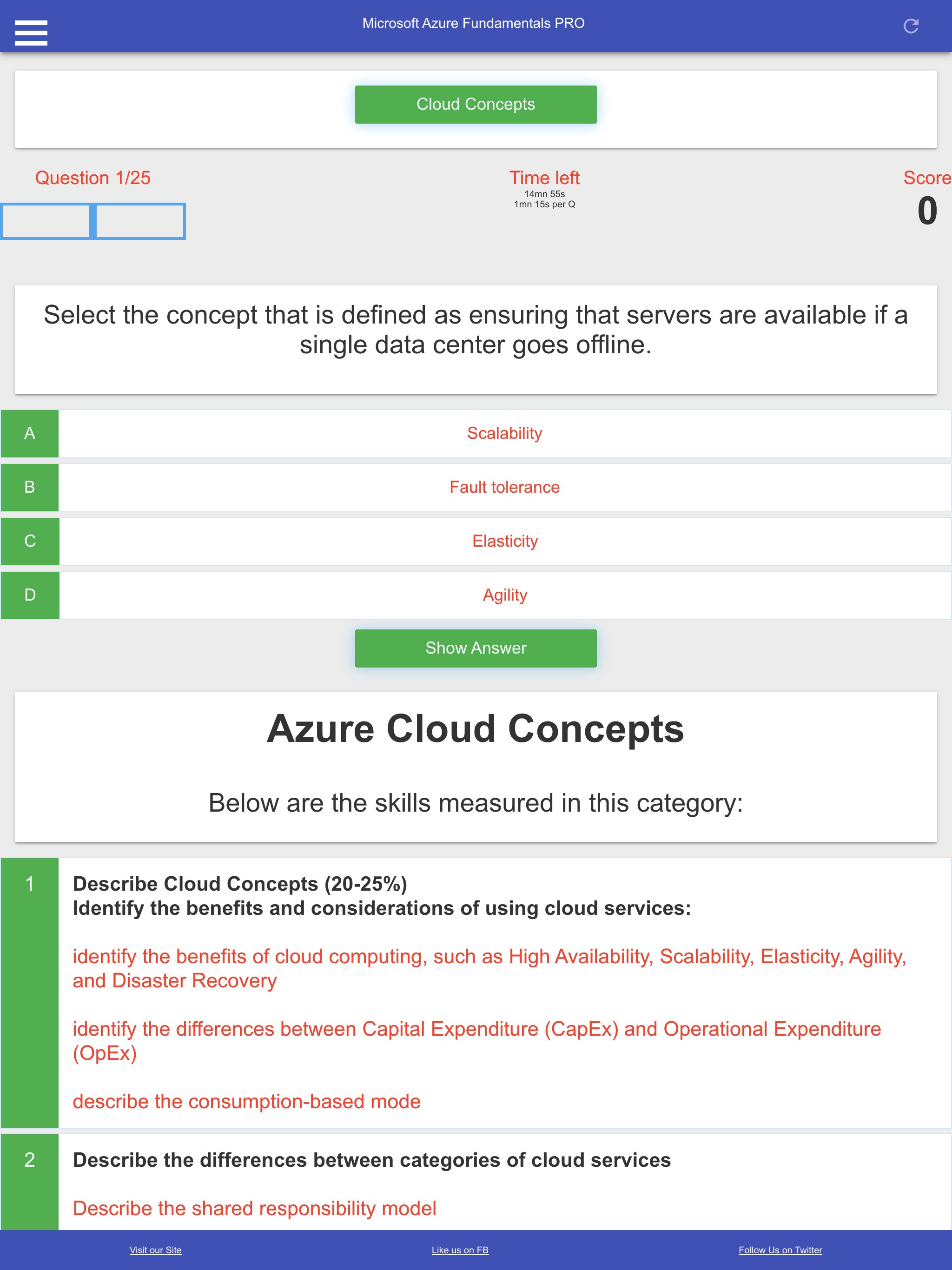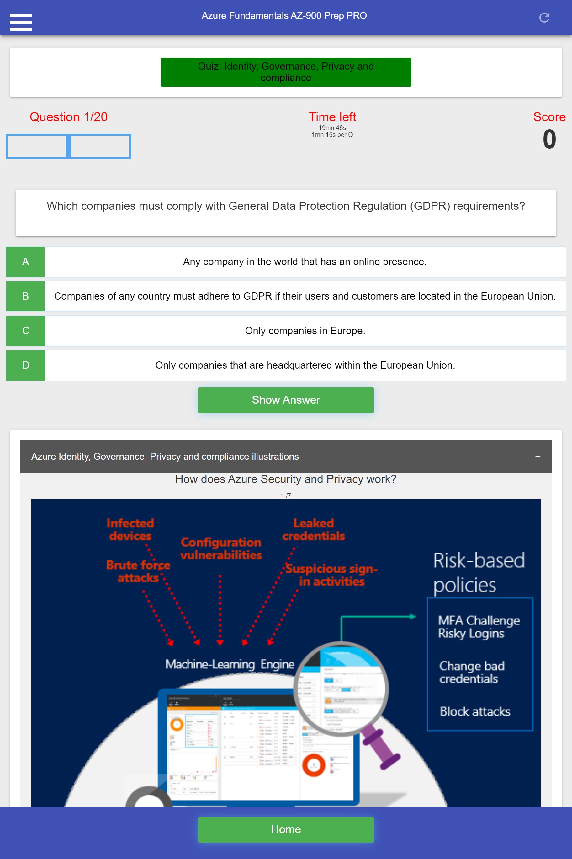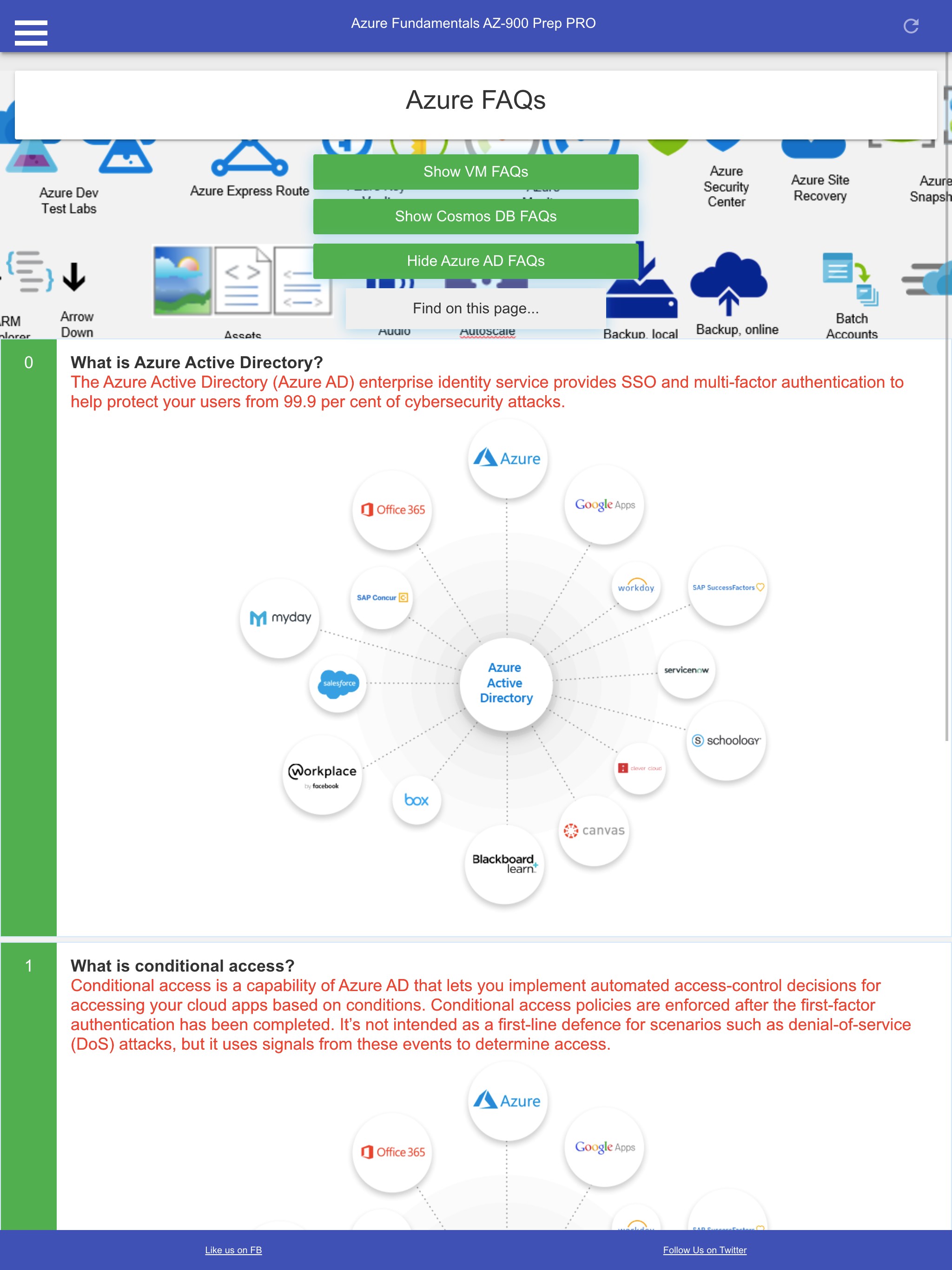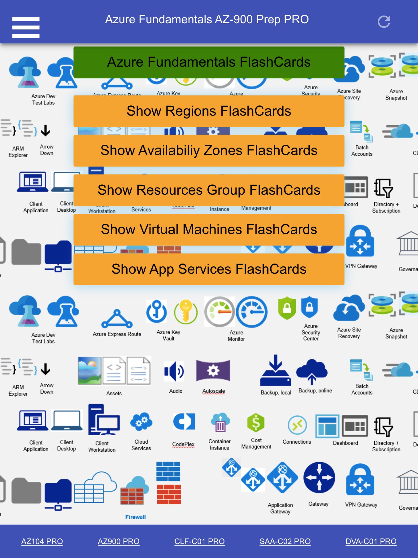 This Azure Fundamentals Exam Prep PRO App will prepare you for the Azure Fundamentals AZ900 Certification Exam. This Azure Fundamentals training App is designed for anyone who wants to learn about Azure, even if you have no prior experience with cloud computing. The App covers core Azure services, core solutions and management tools, Azure pricing and support, and more. By the end of this Azure training App, you will be able to:
