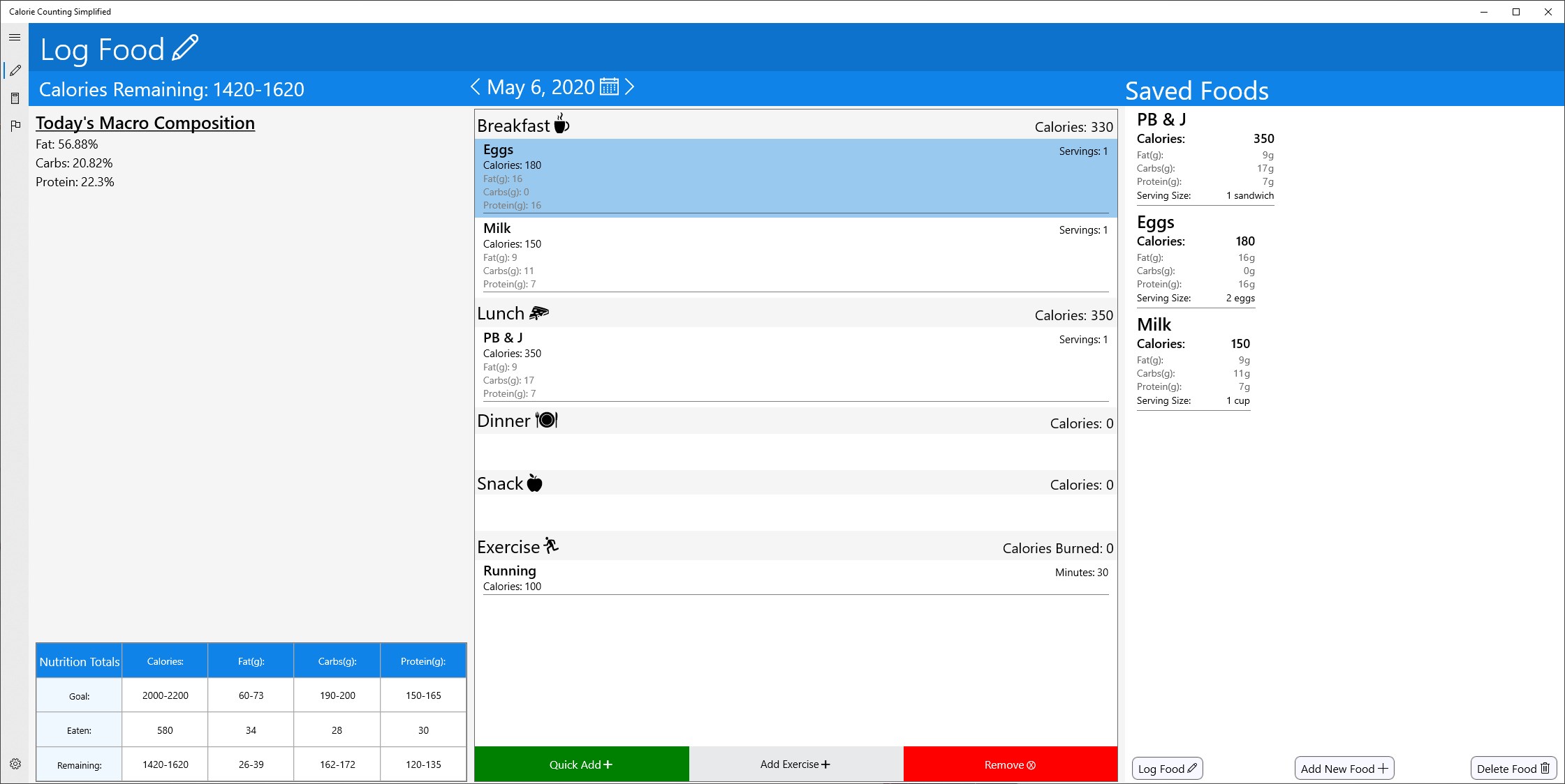 Log the name, servings, calories, and macronutrients in the food you eat to a specific mealMaintain a list of saved foods that you can log from instantly without having to constantly re-enter its nutrition infoLog exercises to keep track of how many calories you\'ve burnedAbility to look at the food eaten for a given day up to a month in the pastIntentionally non-intrusive ads- no annoying pop-ups!No internet connection required to use!