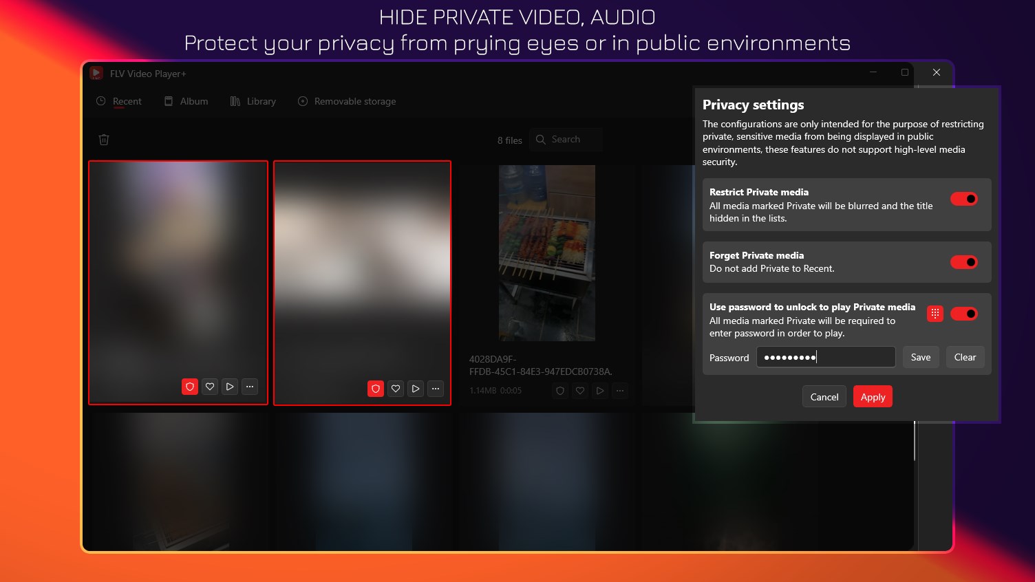 - Setting PIN to prevent nosy access to private videos and music.