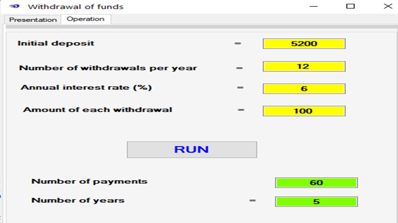 This program can help you if you want to determine how long withdrawals can be made from your bank account before it expires. The data to be provided are: the initial deposit, the number of withdrawals in a year, the interest rate on the remaining part and the amount of withdrawals. Also in this case, the number of withdrawals in a year was considered equal to the number of compounding periods. If the withdrawal amount is less than the interest paid, your account will grow rather than expire: the message will then appear BANK BALANCE is GROWING.