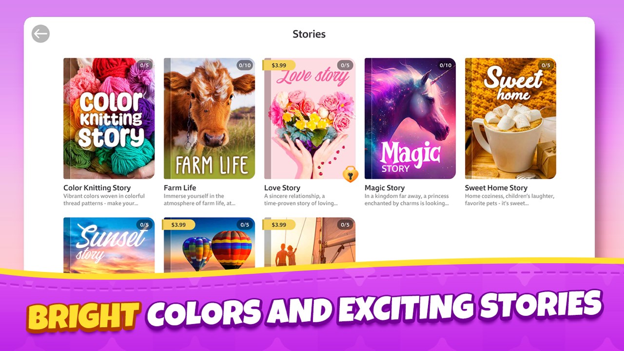 New patterns released regularlyMany categories of pictures: animals, art, flowers, food, cute pets, etcExquisite tools for youEasy way to play with taps for stitchesShare your progress with the worldNice interfaceCalm background music and sounds