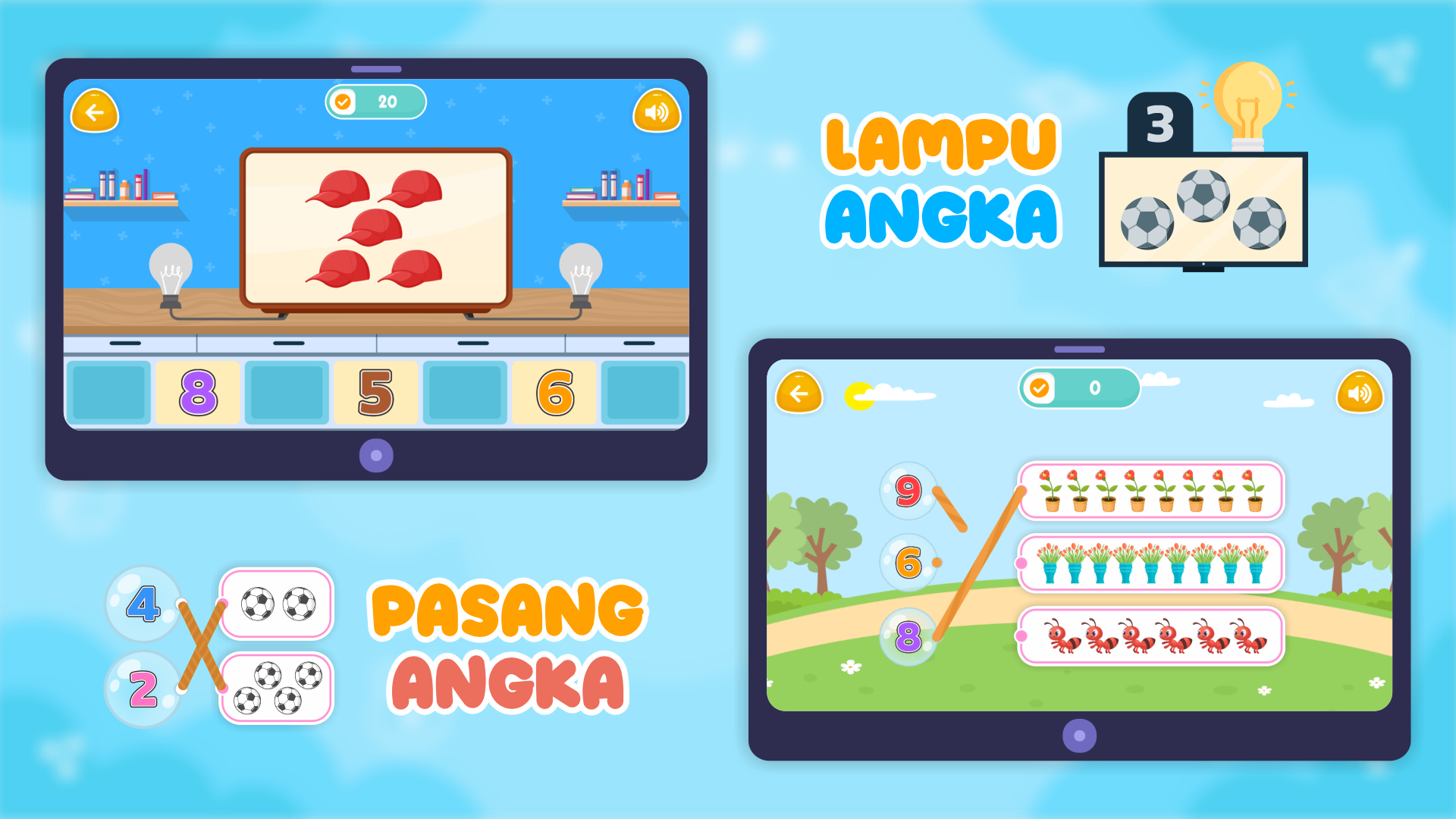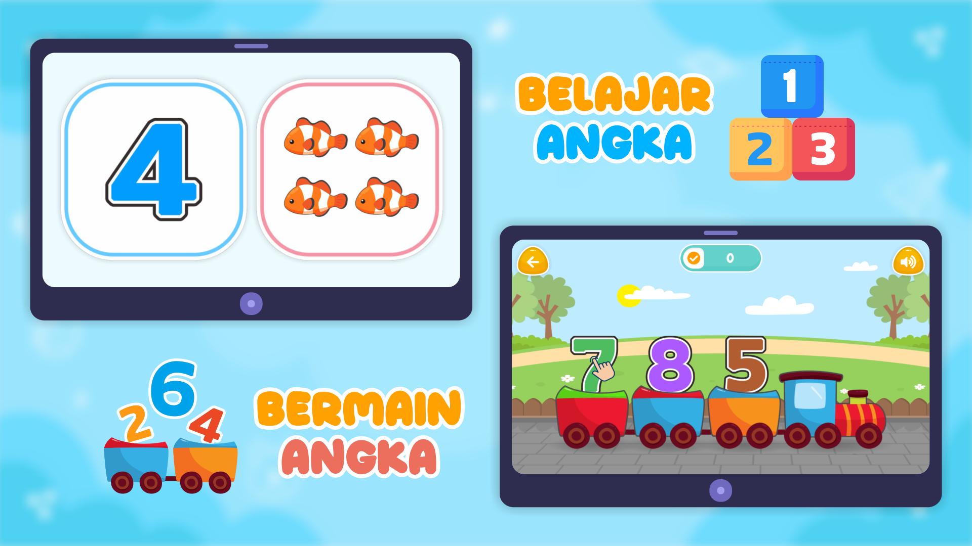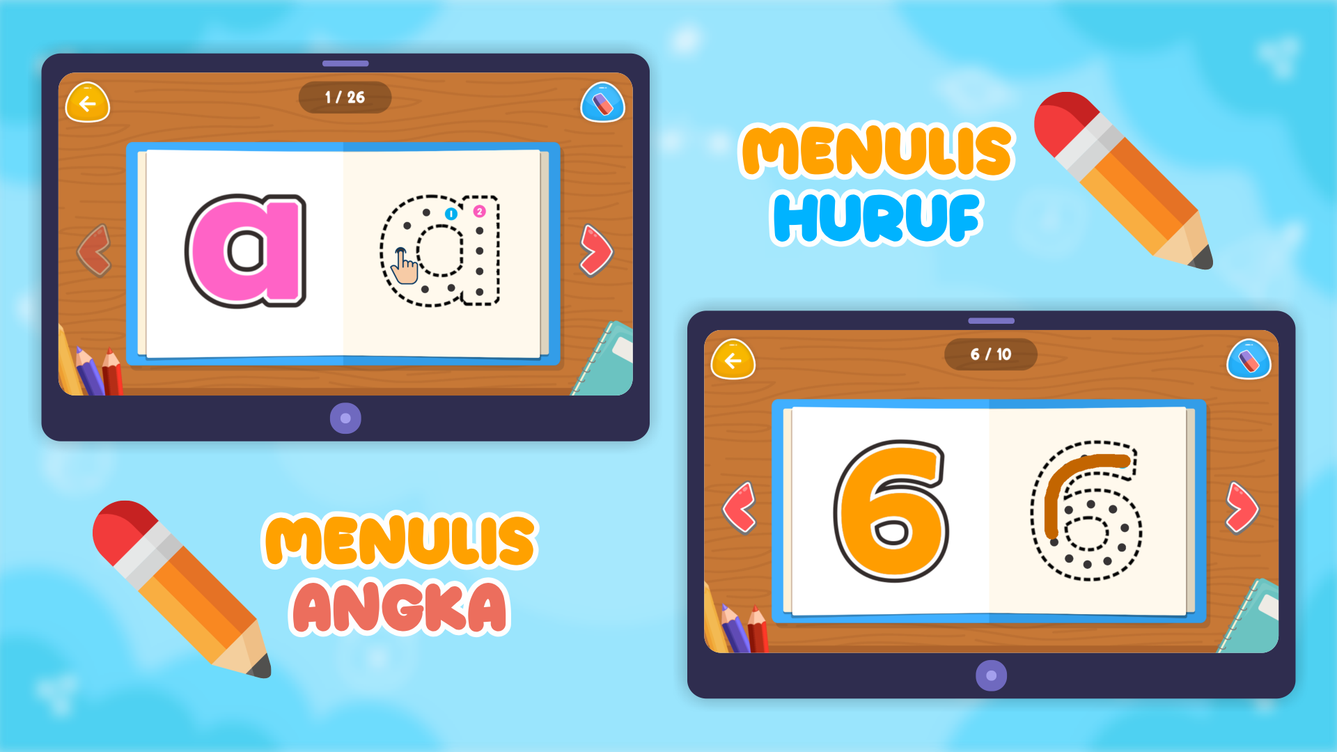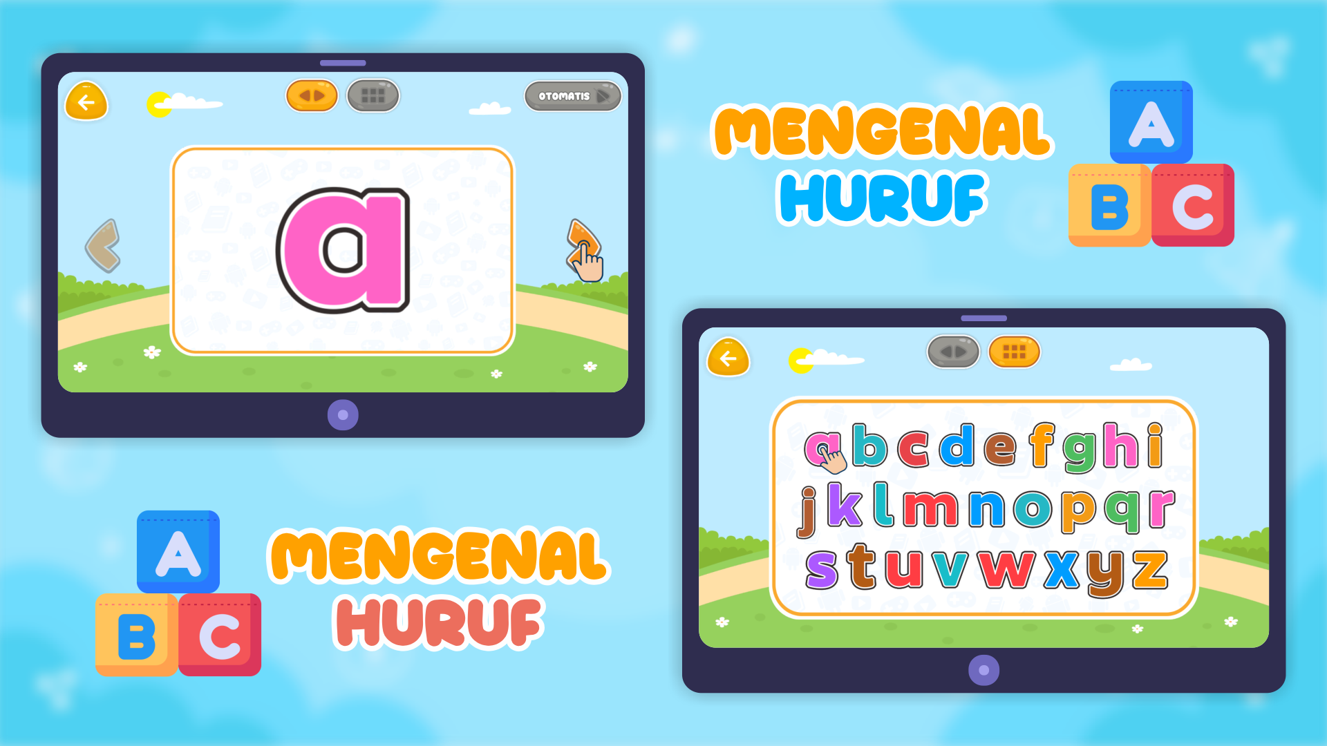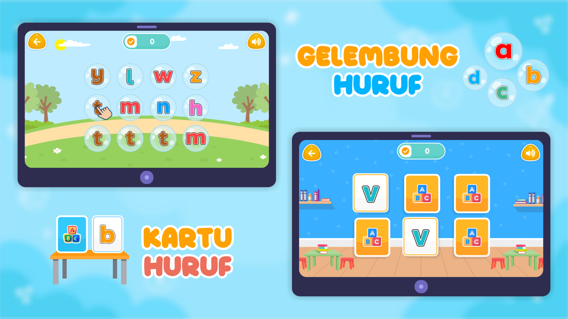 Belajar Mengenal HurufBelajar Menulis HurufBelajar Suku KataBelajar Benda & HurufBermain Gelembung HurufBermain Memory HurufBermain Melengkapi Suku kataBelajar Mengenal AngkaBelajar Menulis AngkaBermain Kereta AngkaBermain Balon AngkaBermain Lampu AngkaBermain Pasang Angka