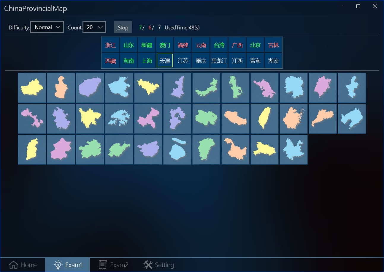 This application can be used to recognize the provincial map of China, as well as to learn to remember the shape and location of The provincial administrative regions of China, including provincial maps, provincial profiles, maps and name correspondence tests.