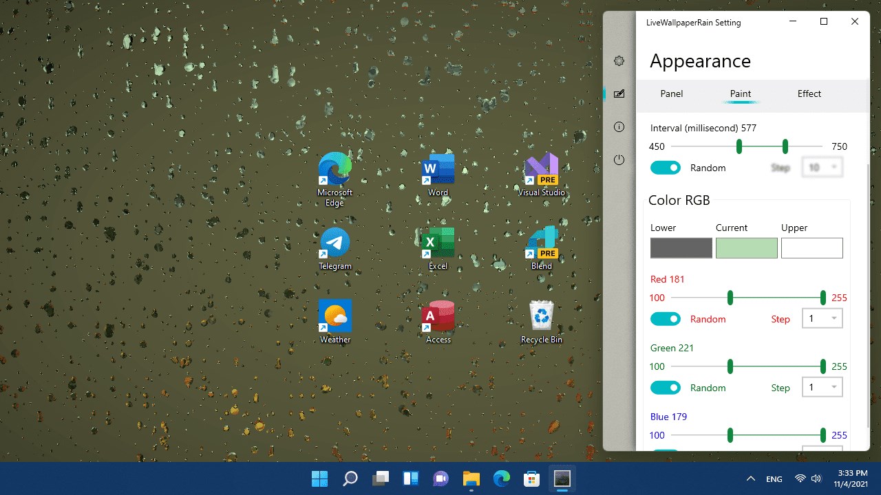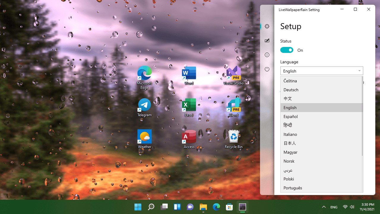 Live wallpaper for desktop simulating rain with sound design and mouse support with the ability to fine-tune visualization parameters