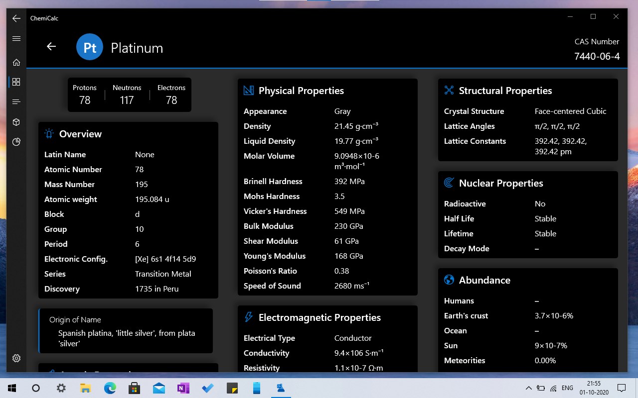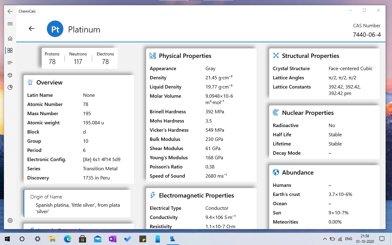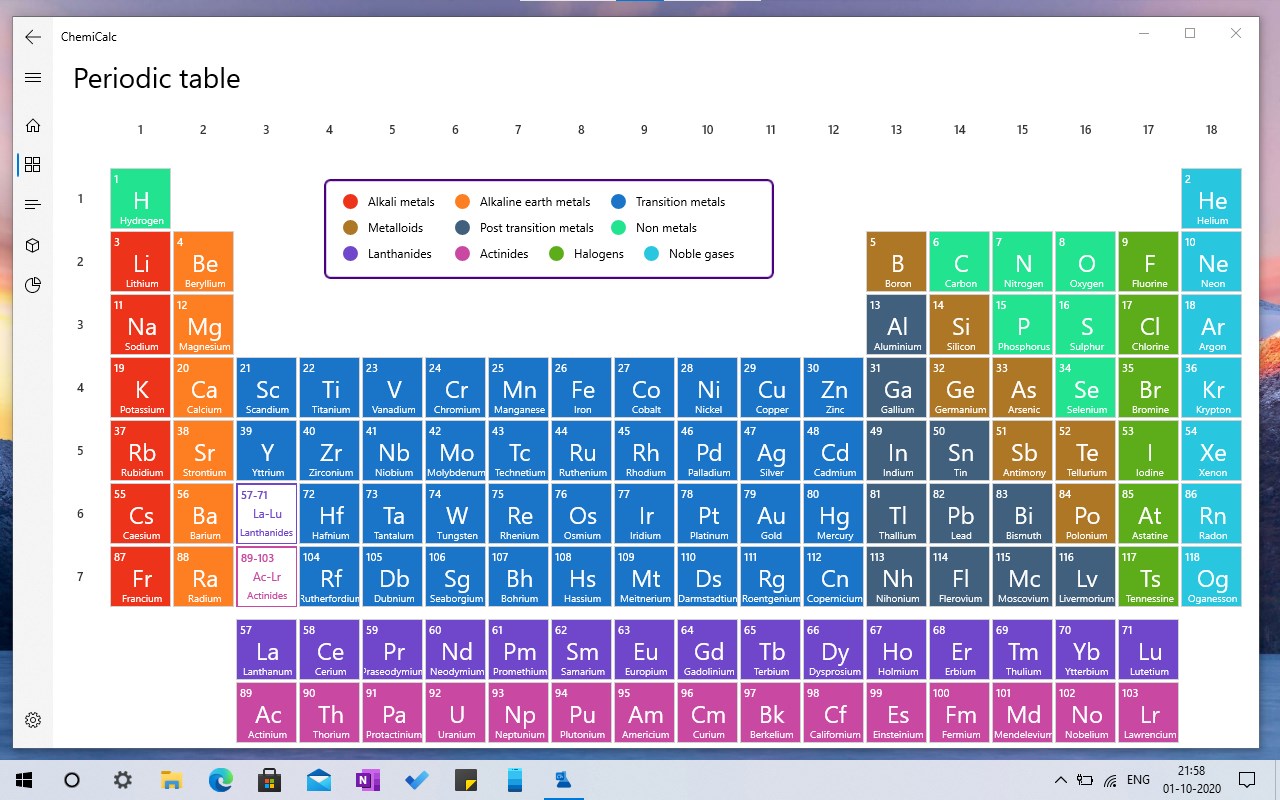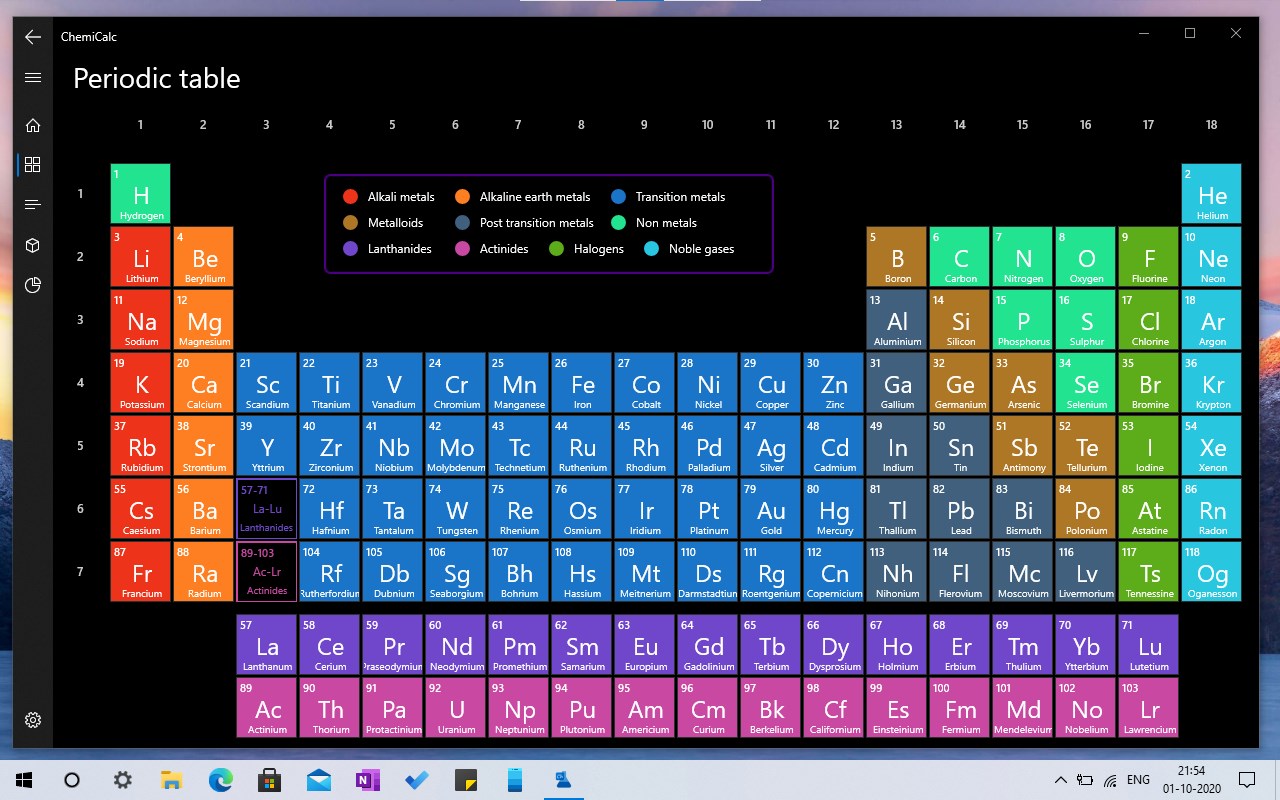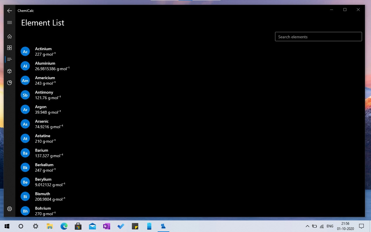 A vibrant periodic tableDetailed info on each elementMolar mass calculatorPercentage calculatorSearchable list of elementsTotally free and fully offlineDark Theme supported