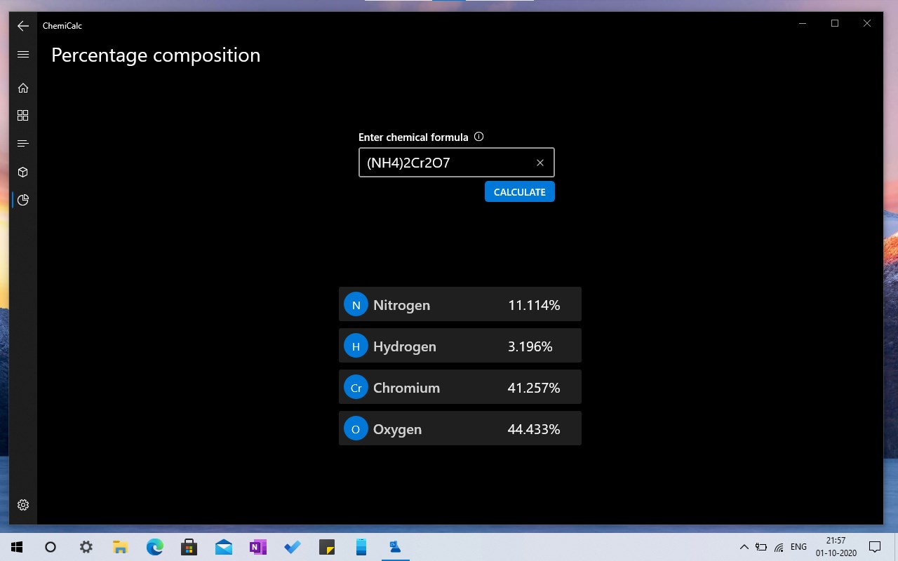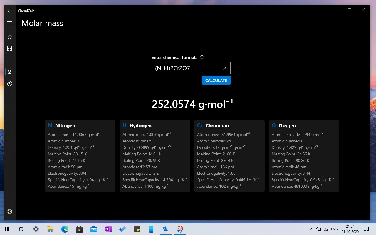 ChemiCalc is a free application for all who love chemistry. Browse a vibrant expandable periodic table! Calculate precise molar mass and the percentage composition of any compound, simple or complex.