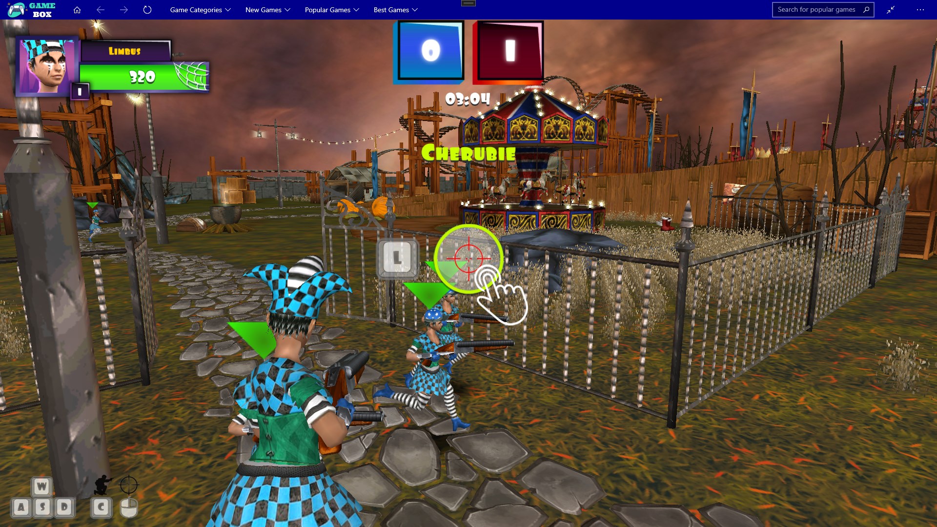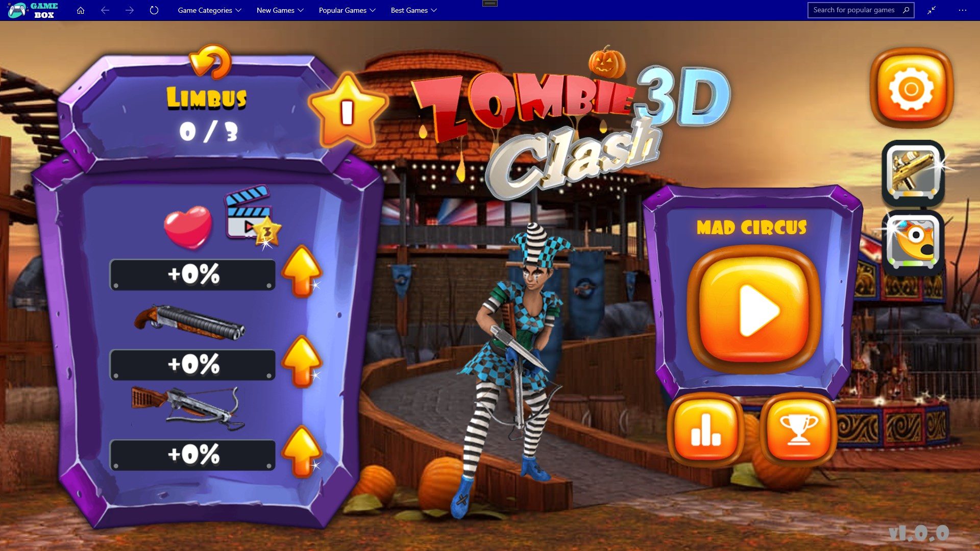 This Halloween join a band of Harlequins in their attempt to take back an abandoned circus site from evil Zombies. Arm yourself with deadly double barrelled shotgun or a special crossbow shooting explosive arrows and lead your way to victory! Be on guard - evil Zombies want to enjoy Halloween party too, so be prepared for some cruel resistance.