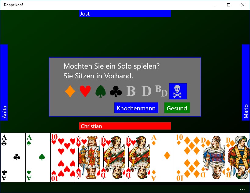Auf zur Fuchsjagd! Spiele eines der komplexesten und anspruchsvollsten Kartenspiele. Doppelkopf Pro beherrscht Farb-Soli, Grand-Spiele sowie den Knochenmann und unterstützt viele weitere der unzähligen Regelvarianten wie