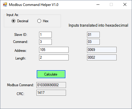 Modbus command and CRC generatorInput parameters in decimal or hexHexadecimal command and CRC will be generated