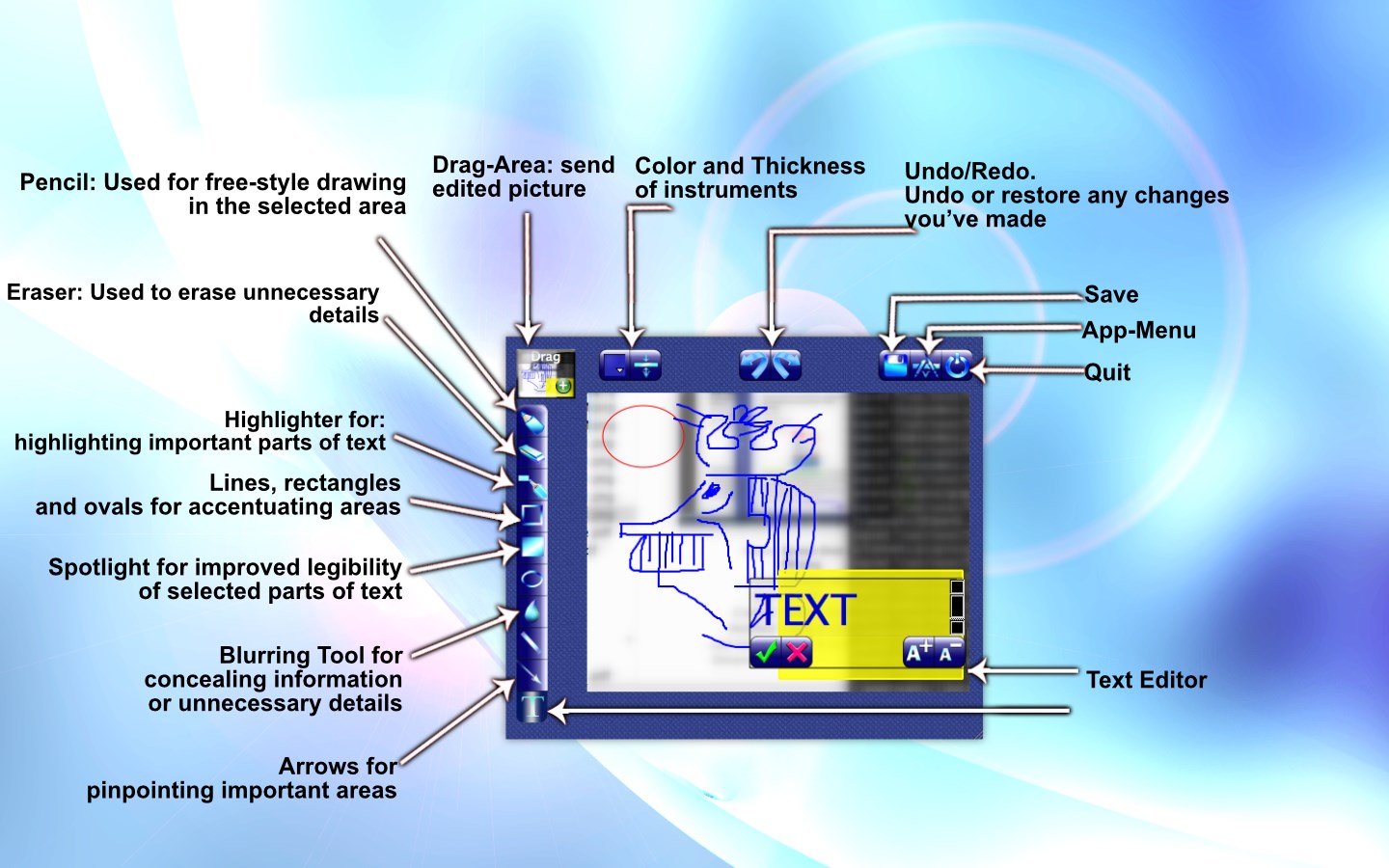 This program is easy to use and does not require any special training. Just make a screenshot and add all your thoughts and ideas in the built-on editor. Then drag the edited screenshot to the program you use to send information or others; or just save the screenshot on your computer hard drive.