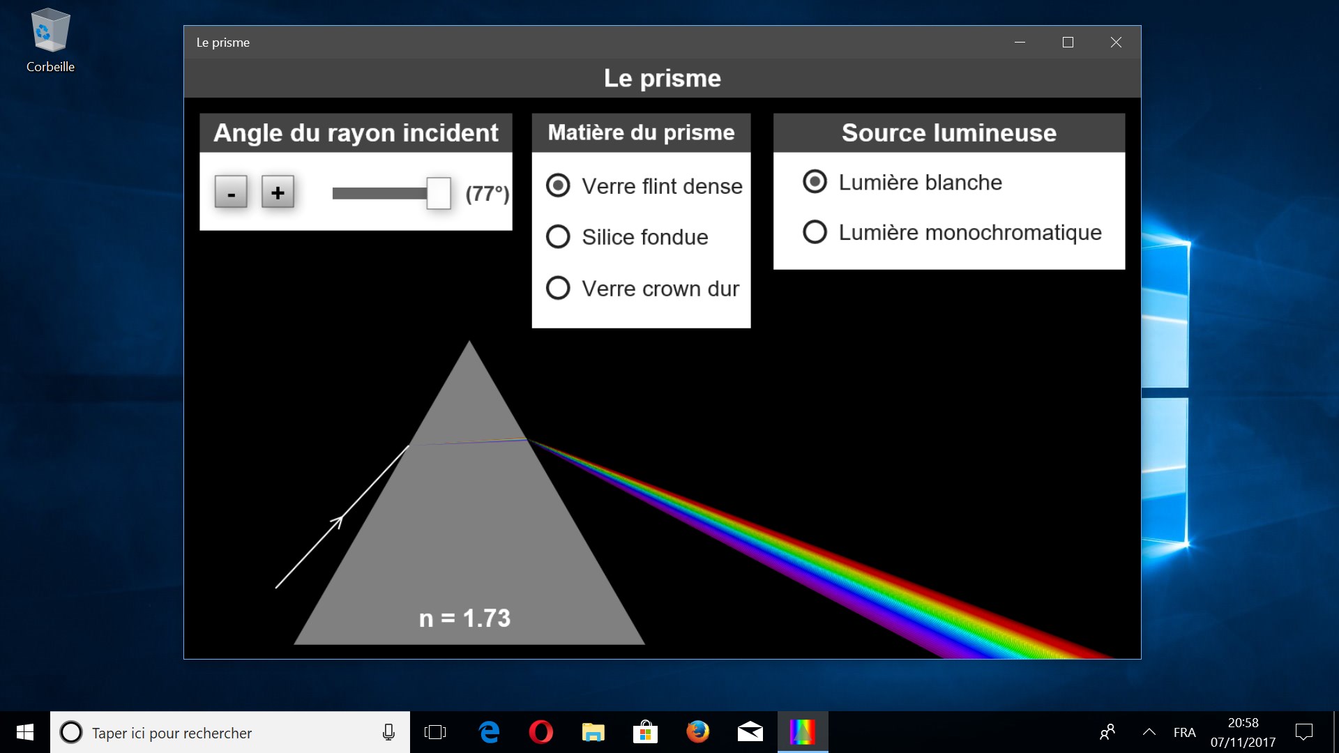 L’application « Le prisme » permet d’étudier la dispersion de la lumière blanche par un prisme ( vous avez le choix entre trois prismes d’indice différents ).