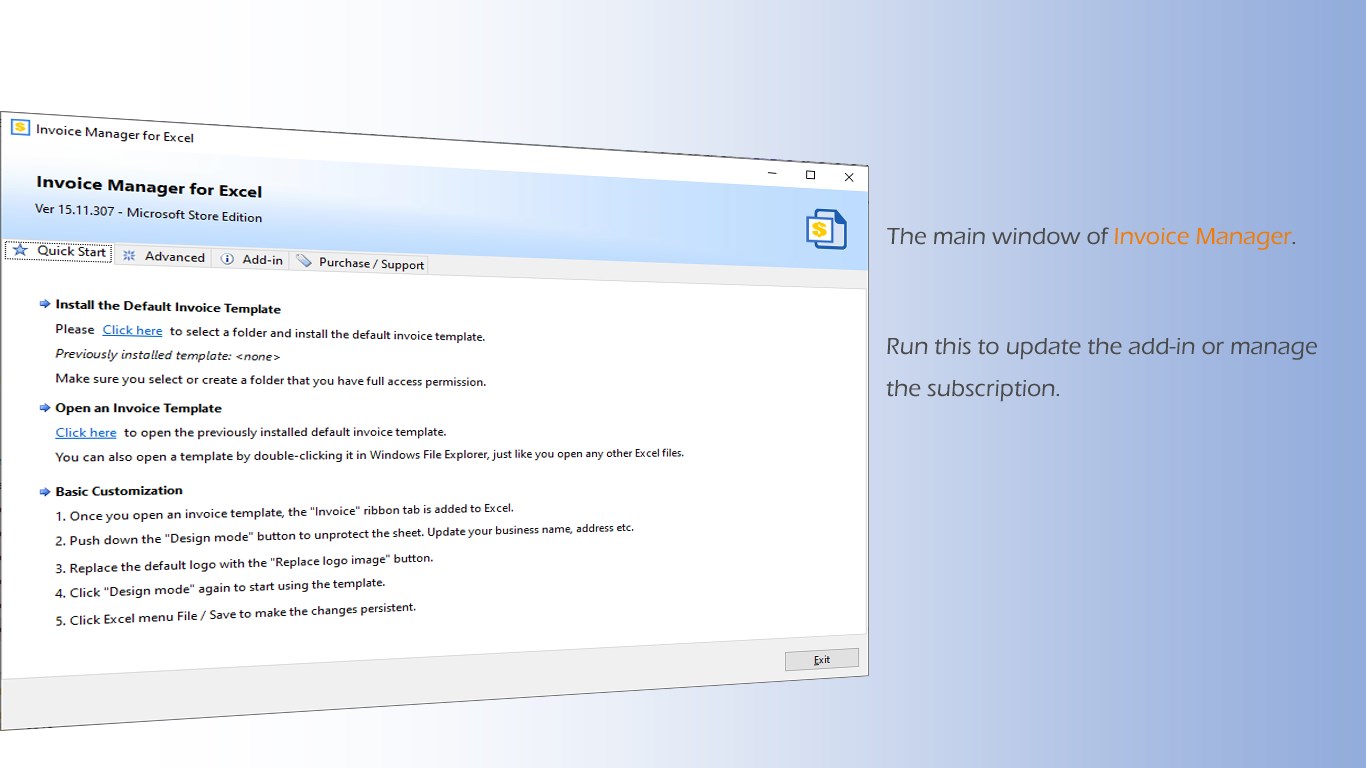 The invoicing app supports both the default Microsoft Access database format and the online SQL Server database. This invoice-generating app requires the desktop version of Microsoft 365 (Excel). It is not compatible with the web version of Office (Office Online, which runs in a web browser).