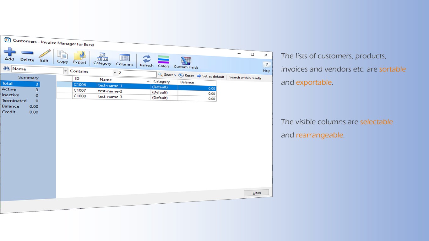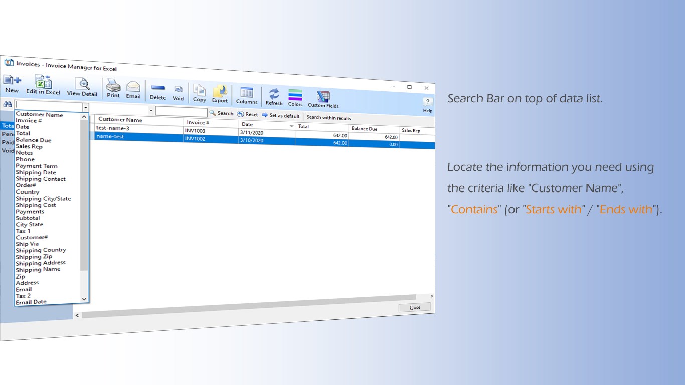 Automatic numbering of invoices, quotes, and purchase ordersOne-click to email invoices, quotes, and purchase ordersSave customers, vendors, products, invoices, etc. to the backend databaseSearch items with operators like "equal to", "contain", "greater than", and "less than"Hundreds of ready-to-use free Excel invoice templatesBy sharing via OneDrive, you can work from multiple locations or on the goDynamic on-sheet picker buttonOne-click conversion from invoice form to quote form or purchase order formSales report, product report, customer statement, payment report, etc.