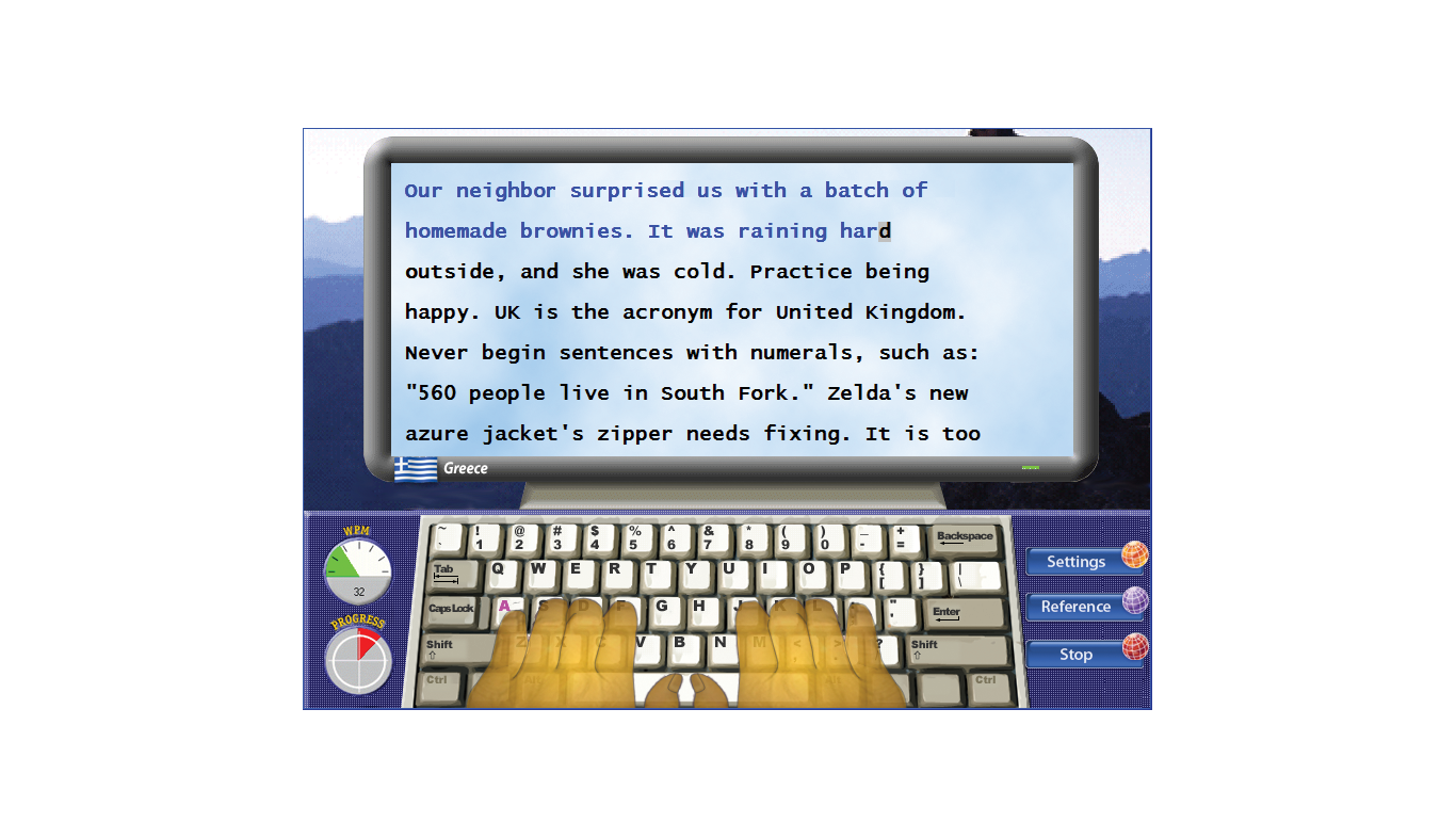 Typing instruction software improves typing speed and accuracy Visit 36 destinations around the world on 3 unique travel themes Choose from 20 educational typing plans or create your own typing plan Lessons, tests, and game challenges motivate typists to improve their typing Multi-level games; 300+ practice articles; progress reports; learn in English or Spanish