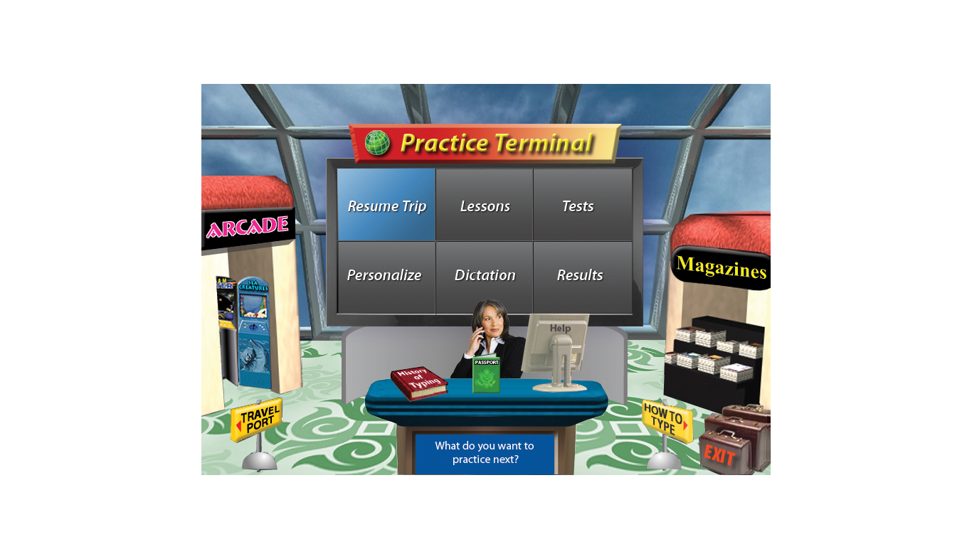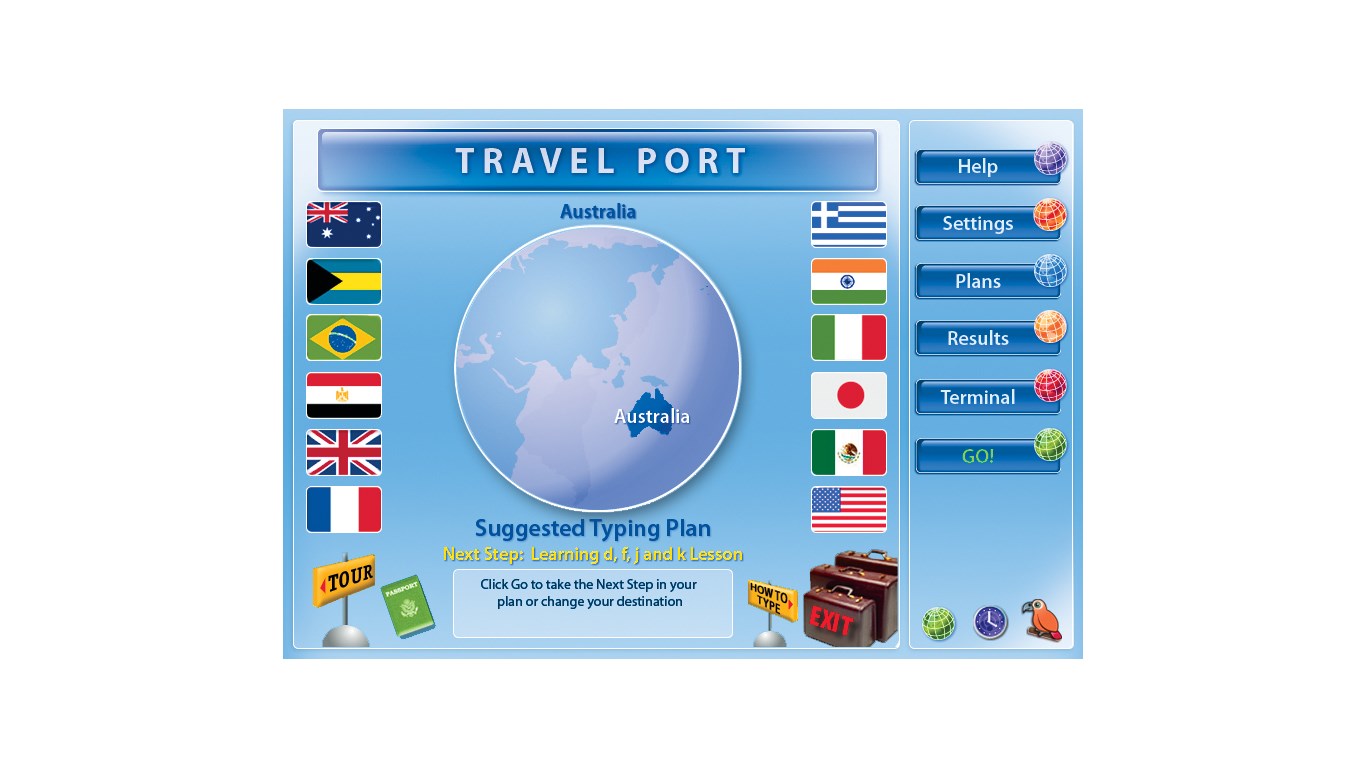 Typing Instructor Platinum takes typists out of the traditional classroom setting, on a thematic adventure, where they learn to type on a world travel trip, a photo safari, or a time travel trip. Typists begin their trip from the Travel Port, where they travel through several time zones around the world. Lessons, tests, and game challenges motivate typists to improve their typing skills so they can advance in the program, visit unique and exciting places, win game challenges, post high game scores, and collect stamp rewards for their travel passports.