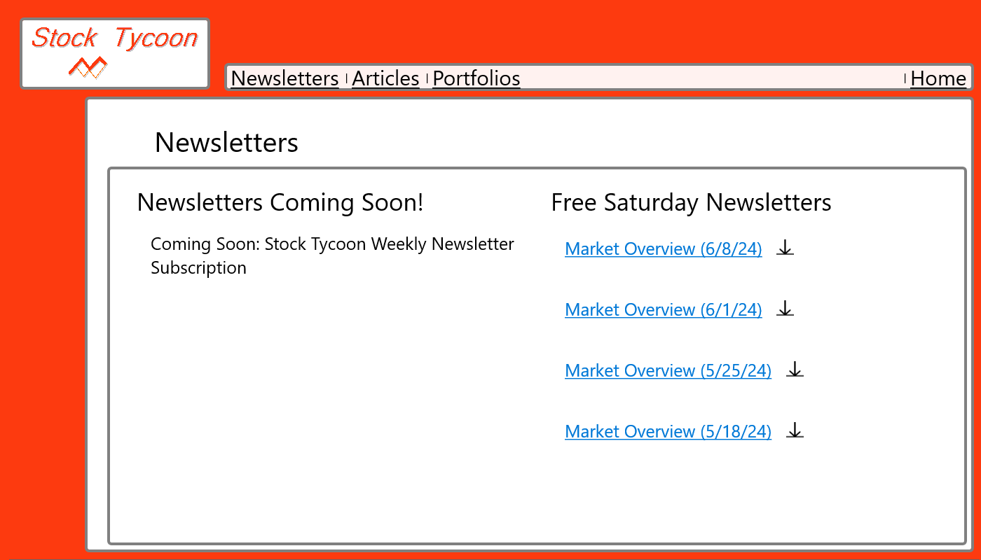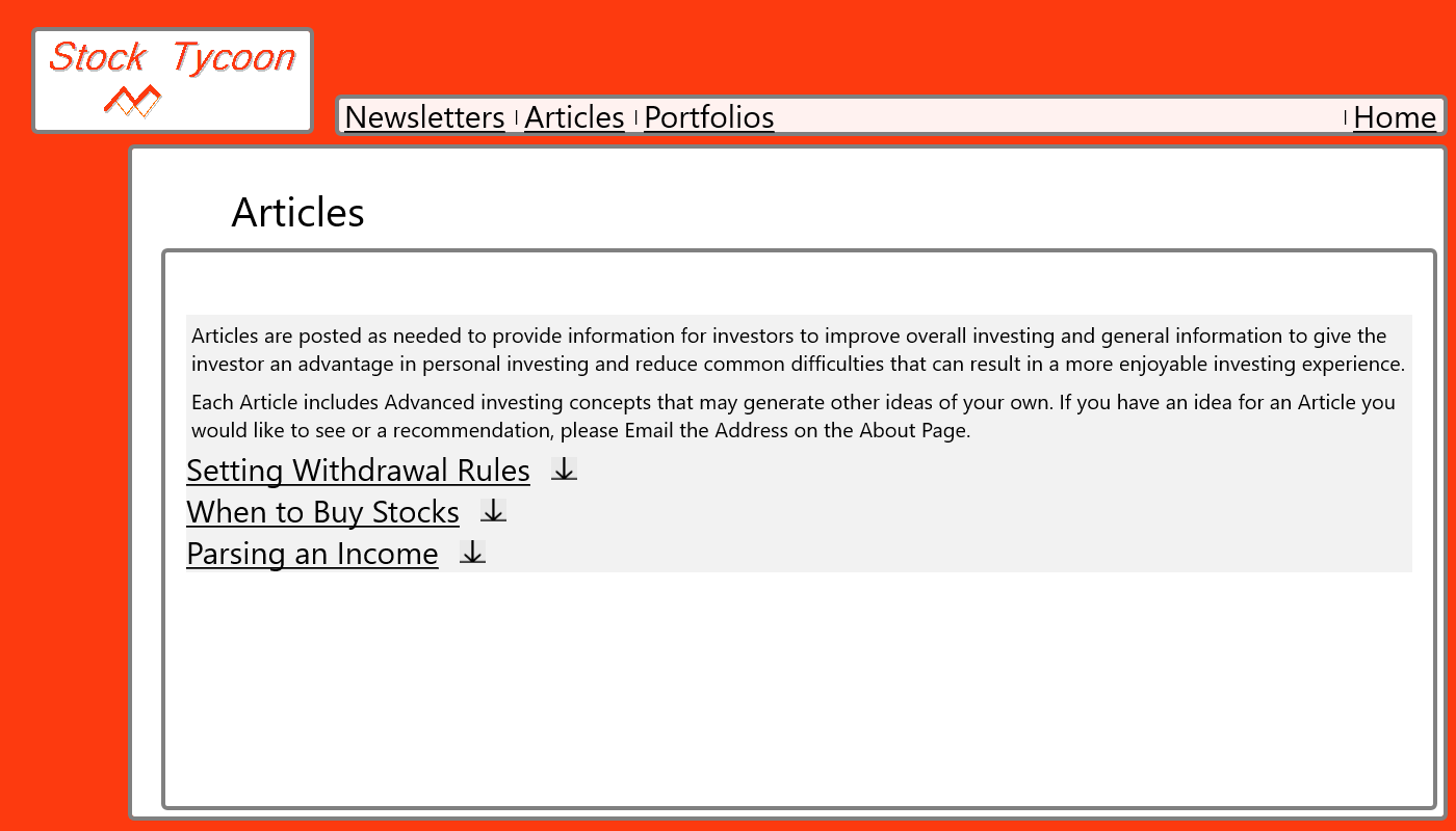 Stock Tycoon News Provides free Market Overview Saturday Newsletters. The content in Stock Tycoon News is focused on long-term and low risk investment decision making. The Articles section has additional information for Money Management and Investing concepts. There are also Portfolio lists provided to offer you quick stock picks that Stock Tycoon recommends. Why make another trade with the same strategy you've already used before, get the Stock Tycoon App and implement a new strategy for less than the cost of your next stock trade.