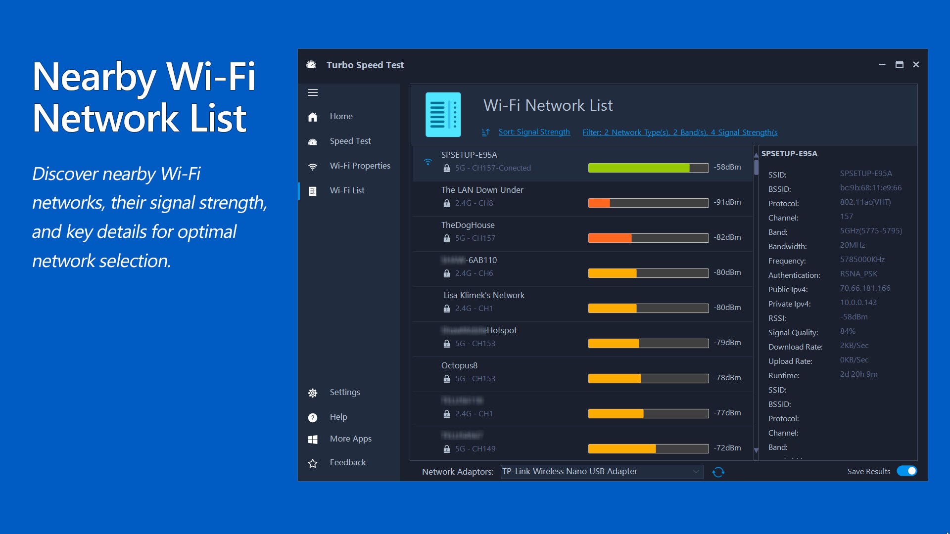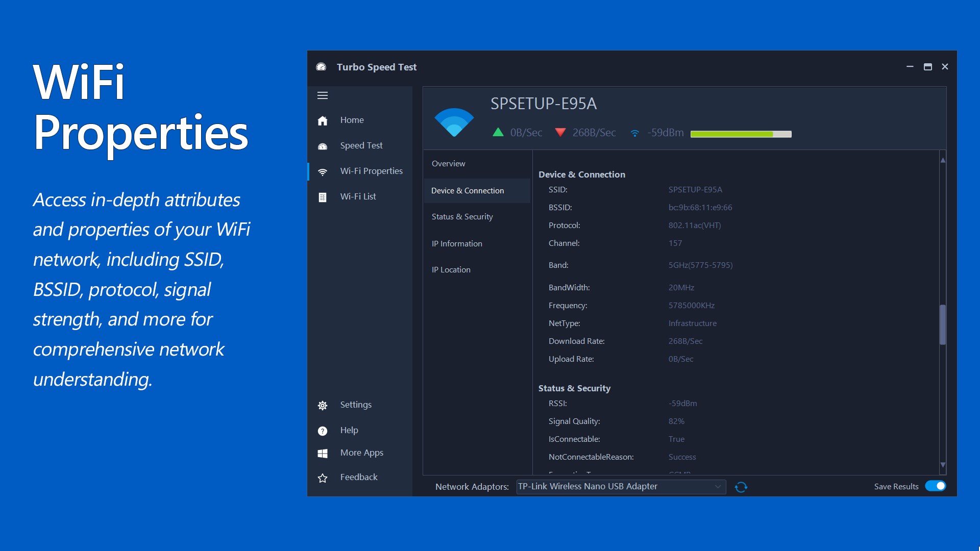 Speed Test: Measure your Wi-Fi bandwidth and performance with ping, jitter, download, and upload tests.Wi-Fi Properties: Access detailed information about your Wi-Fi adapter, network protocol, signal strength, and more.Wi-Fi Network List: View available Wi-Fi networks, their signal strength, frequency, and other essential details.Device & Connection: Gain insights into your device\'s connection attributes, such as SSID, BSSID, and network speed.Status & Security: Monitor the status of your Wi-Fi connection, signal quality, encryption type, and authentication.IP Information: Access details about your network\'s IP configuration, including IPv4 and IPv6 addresses, DNS, and gateway.