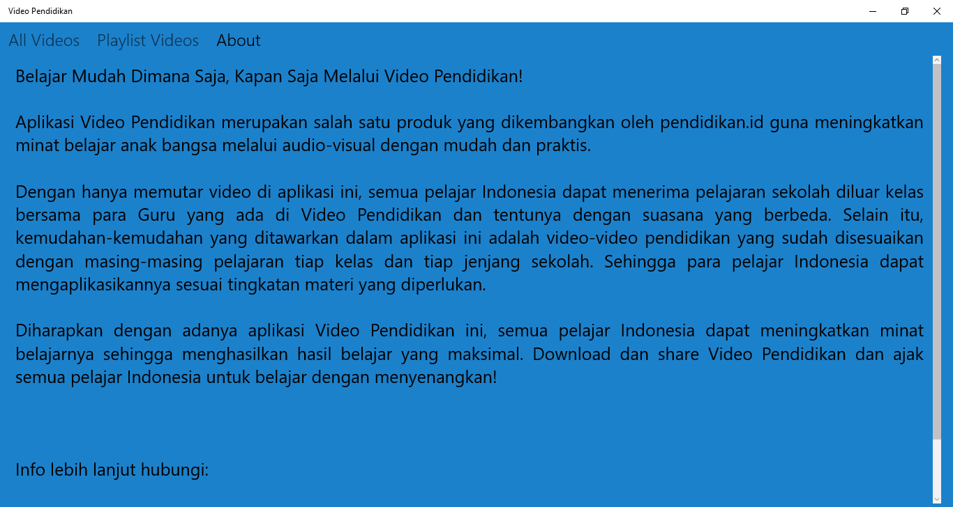 Dengan hanya memutar Video Pendidikan di tablet / smartphone, semua pelajar Indonesia dapat menerima dan mengulas kembali pelajaran sekolah diluar kelas. Diharapkan dengan adanya Video Pendidikan ini, semua pelajar Indonesia dapat meningkatkan minat belajarnya sehingga menghasilkan hasil belajar yang maksimal.