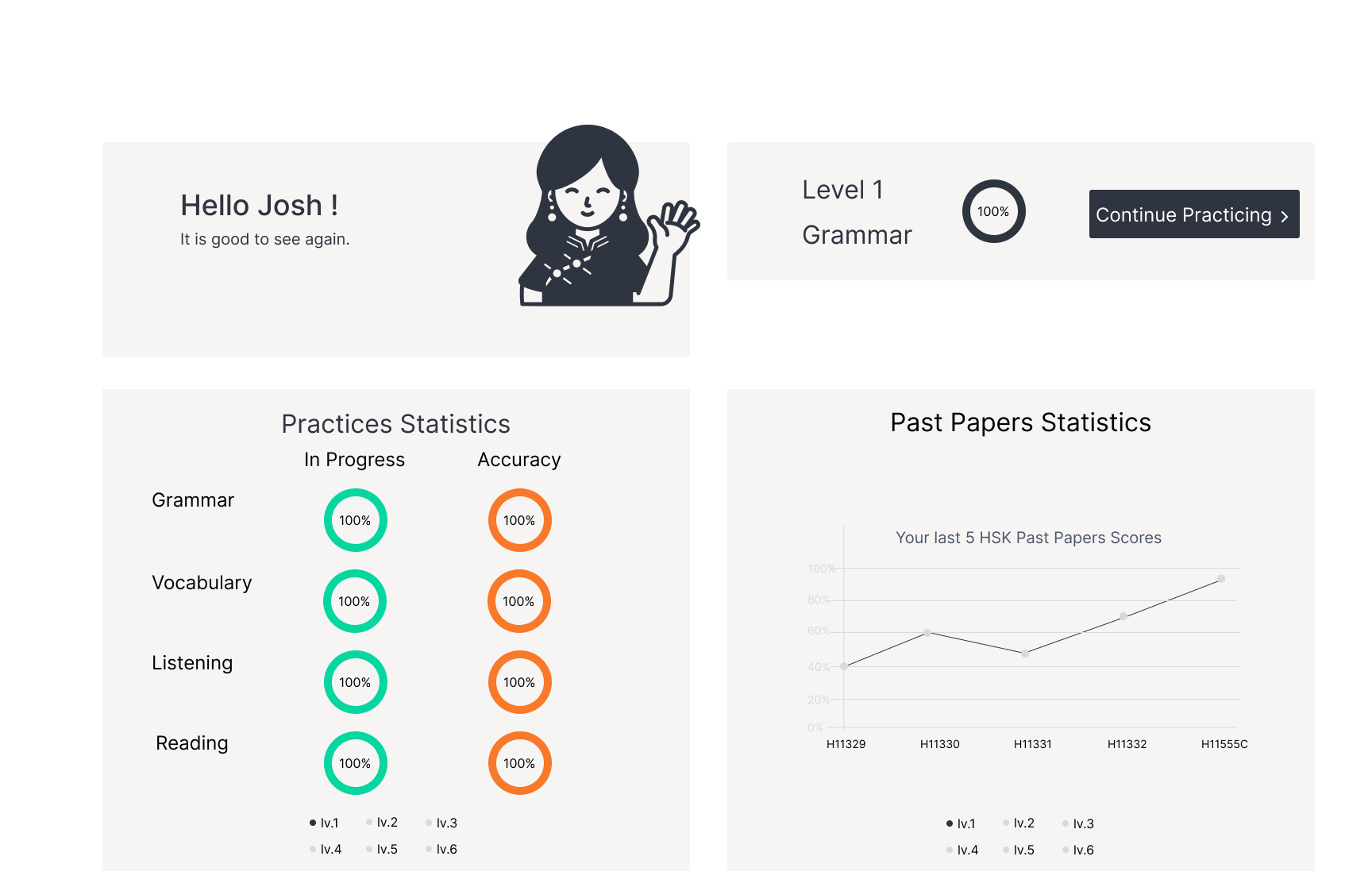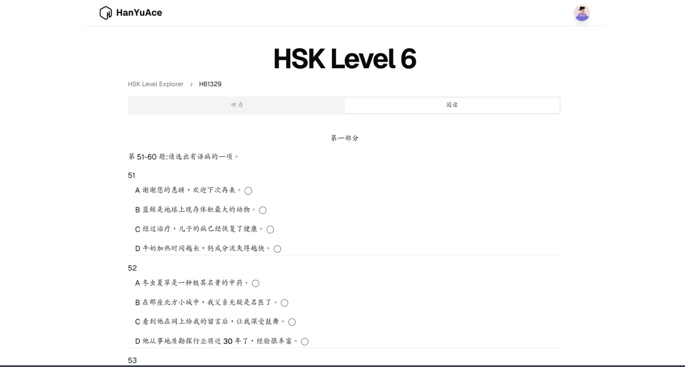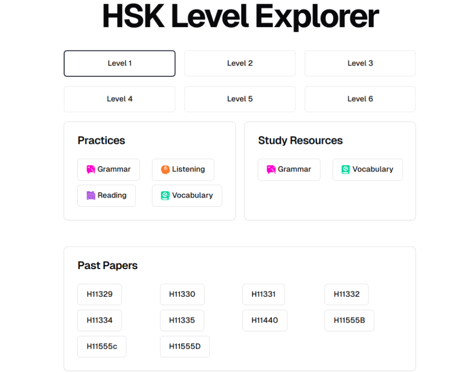 Free Content: Enjoy one free past paper for each HSK level, along with a selection of grammar, reading, listening, and vocabulary exercises.