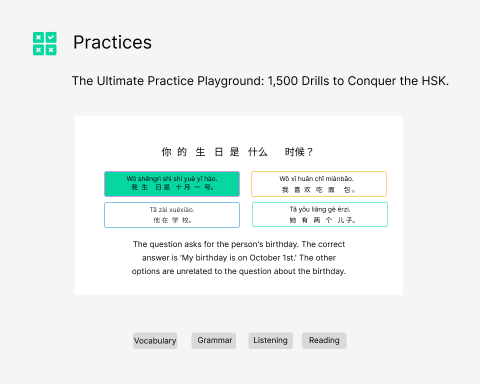 Grammar Practice: Strengthen your understanding of Chinese grammar with targeted exercises.