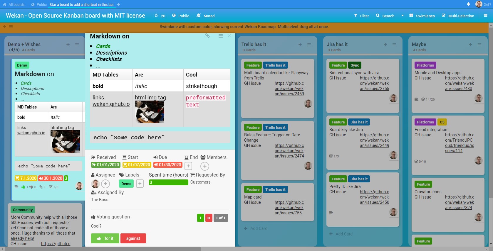 Boards, Swimlanes, Lists, Cards, Checklists, Attachments, WIP Limit, IFTTT Rules like Trello Butler, Import Board from Trello, Dark Mode and other themes