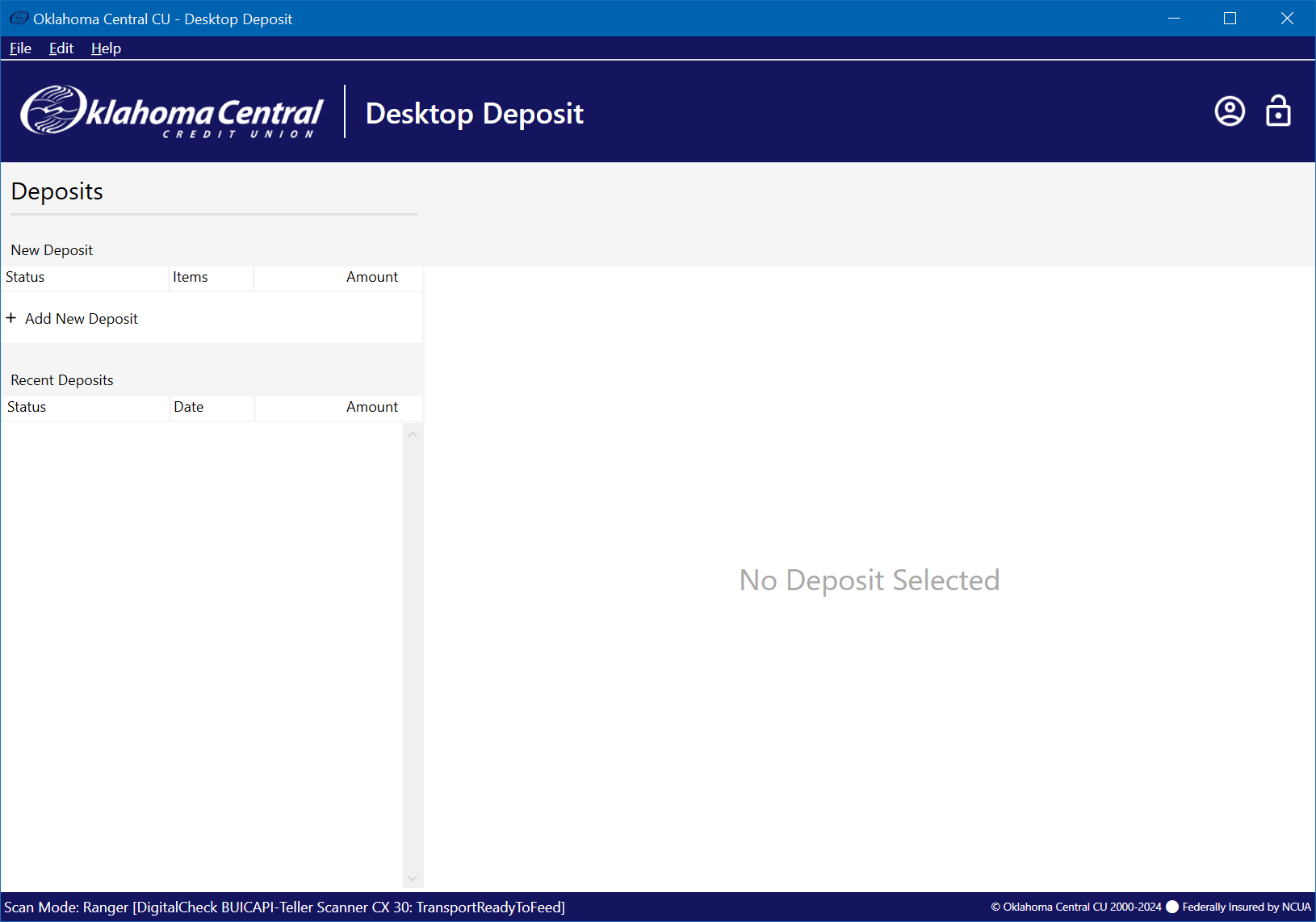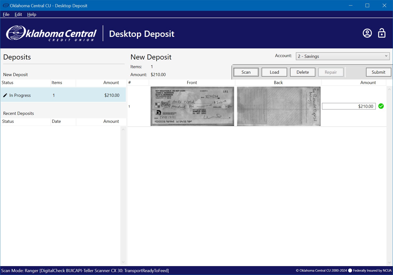 Oklahoma Central CU Desktop Deposit enables members to make multi-check deposits to their accounts using any TWAIN, WIA or Ranger enabled scanner. The application has a user-friendly interface design and is especially designed for high-volume deposits and high-performance check scanners.