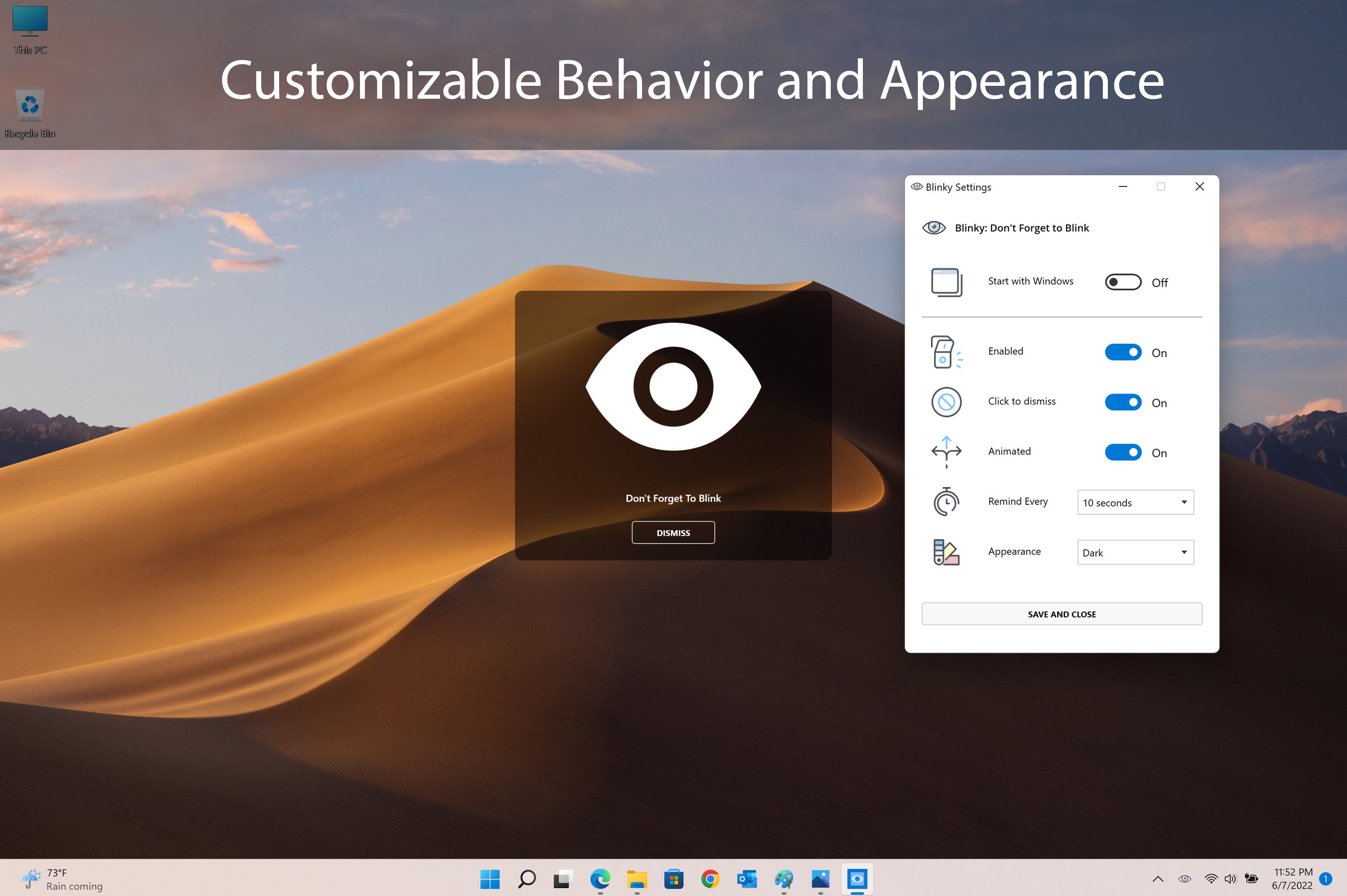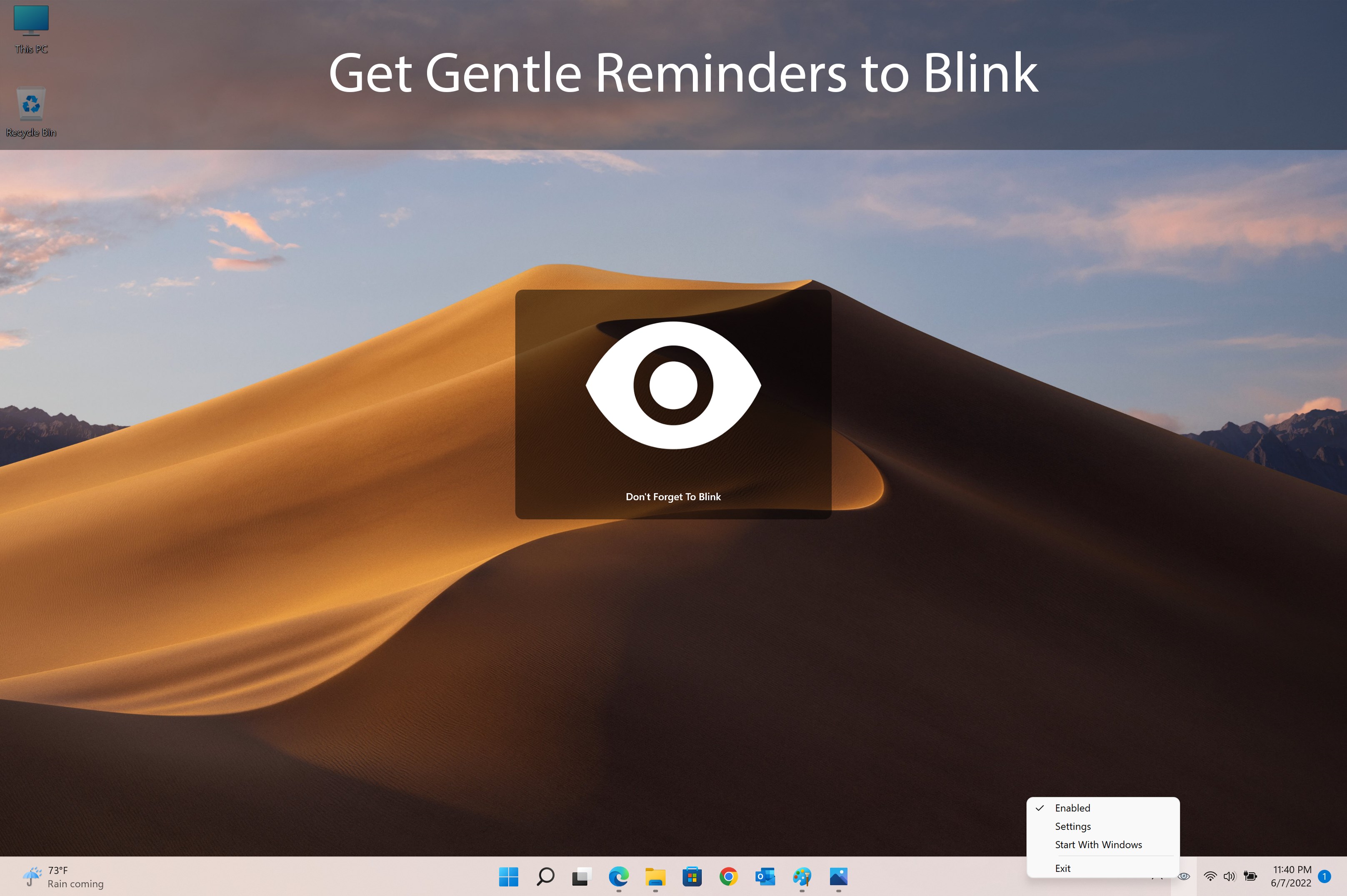 Protect your eyes and improve your health with Subtle Blink Reminder, a lightweight app designed to gently remind you to blink regularly while working on your screen. Perfect for reducing eye strain and promoting better eye health during long hours of computer use.