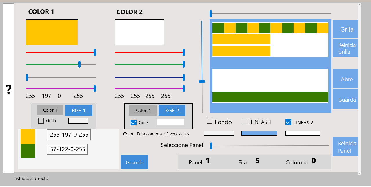 Puede agregar hasta cuatro GRILLAS para diseñar una paleta de colores., pudiendo guardar el código asociado a cada color en cada GRILLA. Puede GUARDAR cada grilla y lista de colores. Luego ABRIR para modificar.