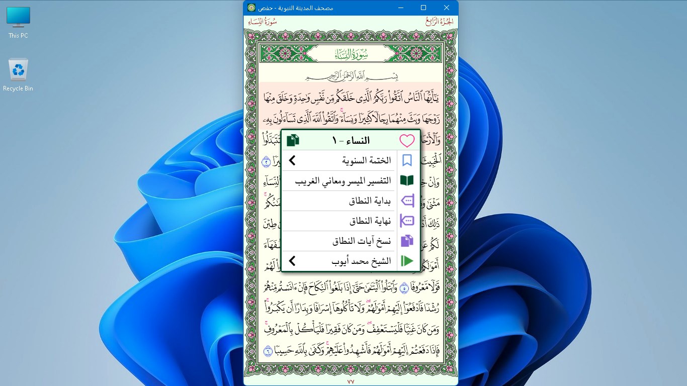- The possibility of repeating the recitation at the level of the Ayah(verse), page, surah, Part (Juzz) or range according to a specified number of times, in order to facilitate memorization of the Qur’an.