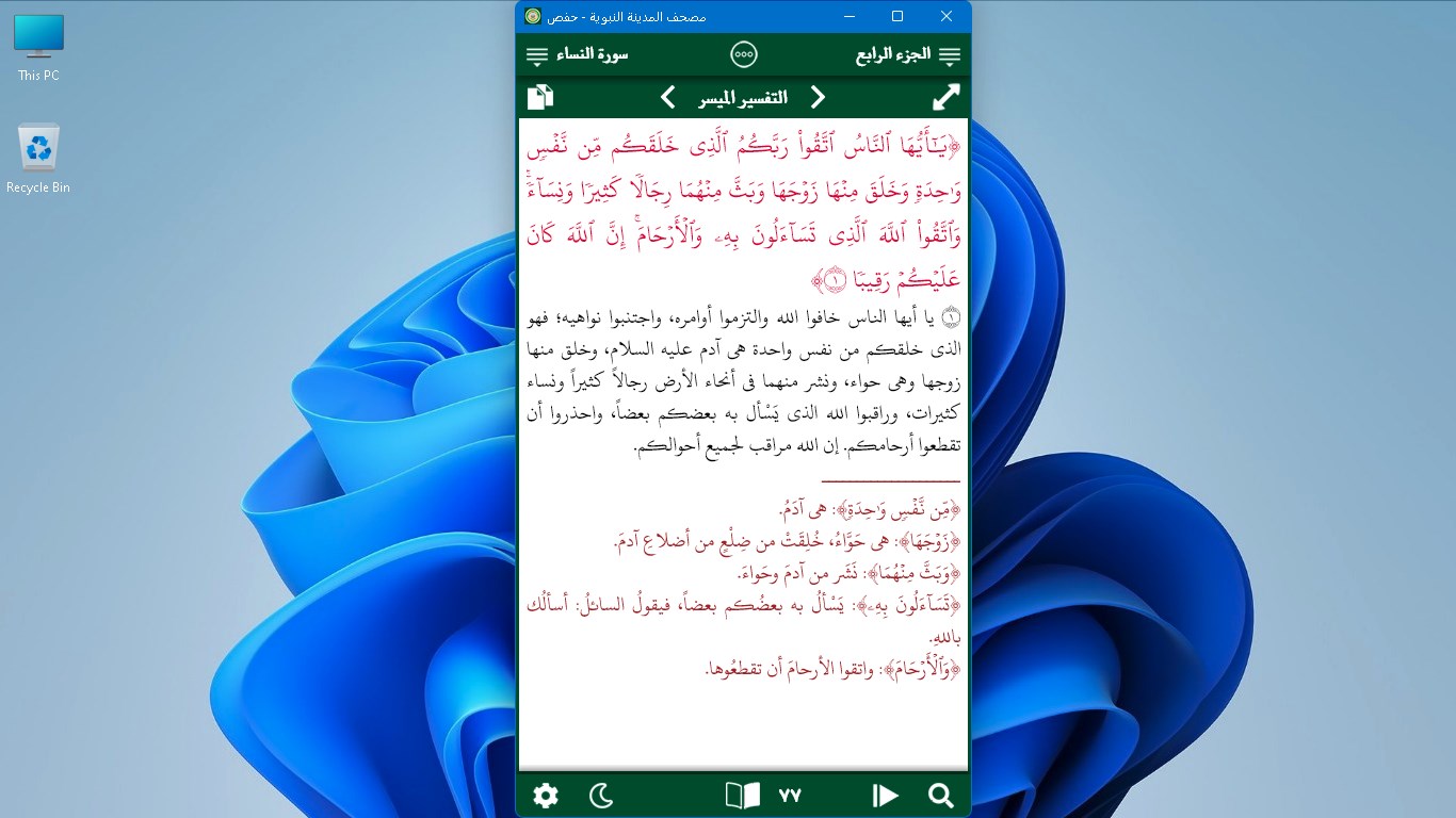 - Ability to modify colors of the page, the Quranic text, the notes, the reference mark, and the selection color of the verse, with a button to reset them.