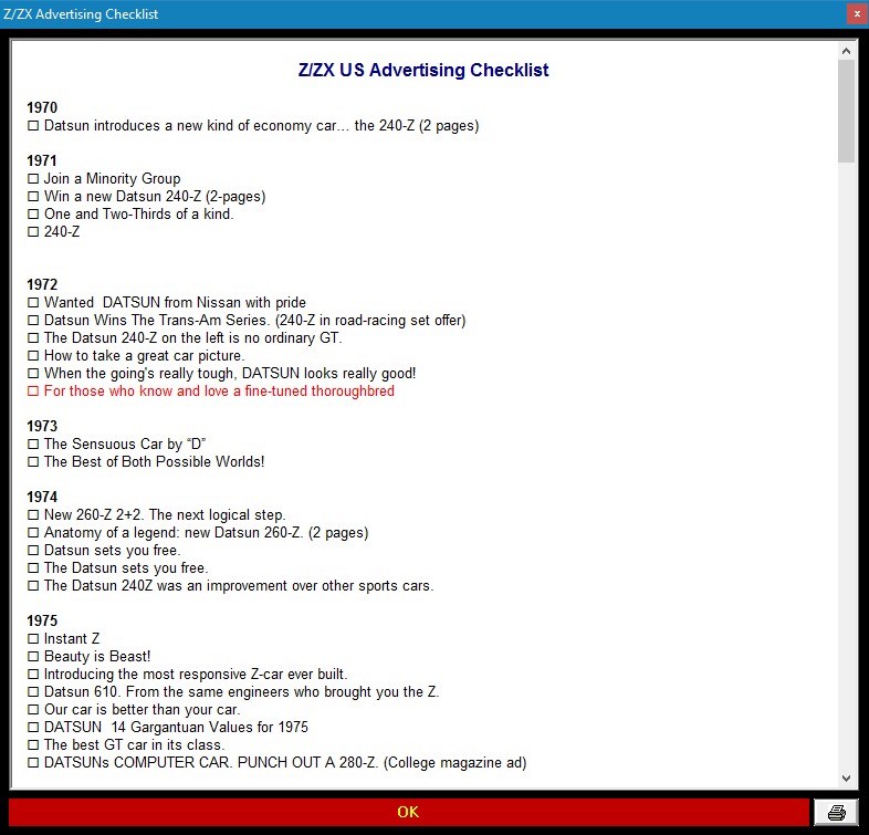 "Z/Zx" Ads - From the Beginning 1967 - 2022 Take a nostalgic journey back to the beginning of the "Z". See the very first ads as they appeared in magazines back in 1970. Then follow the evolution of the "Z" right on up to the latest convertible supercars and the 2022 400Z Prototype. This unbelievable multimedia collection of almost every "Z/Zx" ad released by Datsun/Nissan in the US (nearly 200!) will fascinate you for hours! This is the largest collection of "Z" ads available in one resource anywhere.
