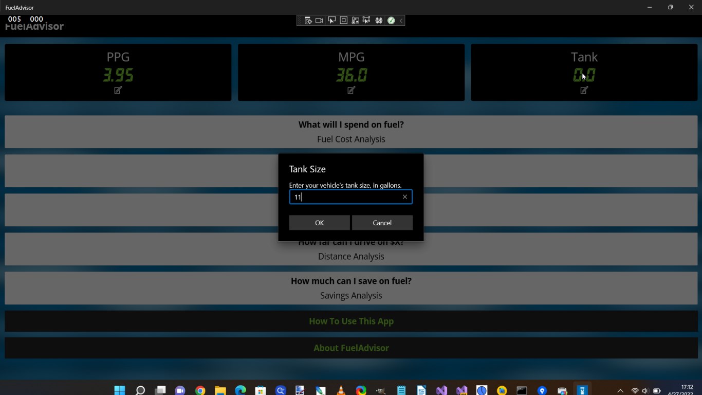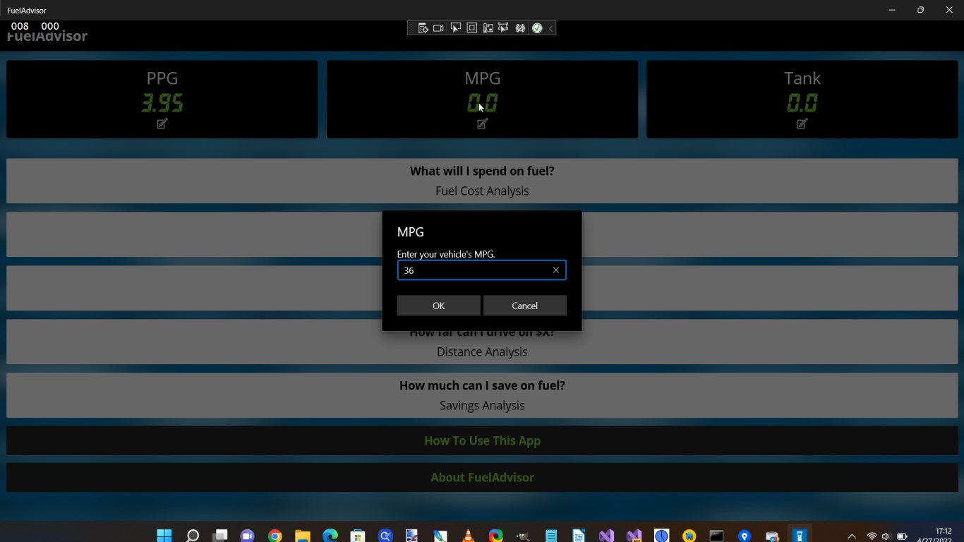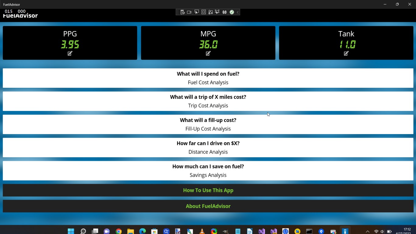Easy to use! Enter the price of gas from your preferred filling station, along with your vehicle\'s MPG rating and fuel tank size in gallons, and FuelAdvisor crunches the numbers.Fuel Cost Analysis calculates gas expenses for time frames ranging from a week to a month.Trip Cost Analysis calculates how much you can expect to spend to drive a specified number of miles.Fill-Up Cost Analysis calculates how much a full or half fill-up costs.Distance Analysis calculates how far you can drive for a certain amount of money.And Savings Analysis calculates the cost savings for two prices of fuel at different stations, or cash vs. credit.