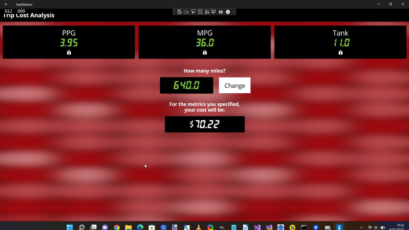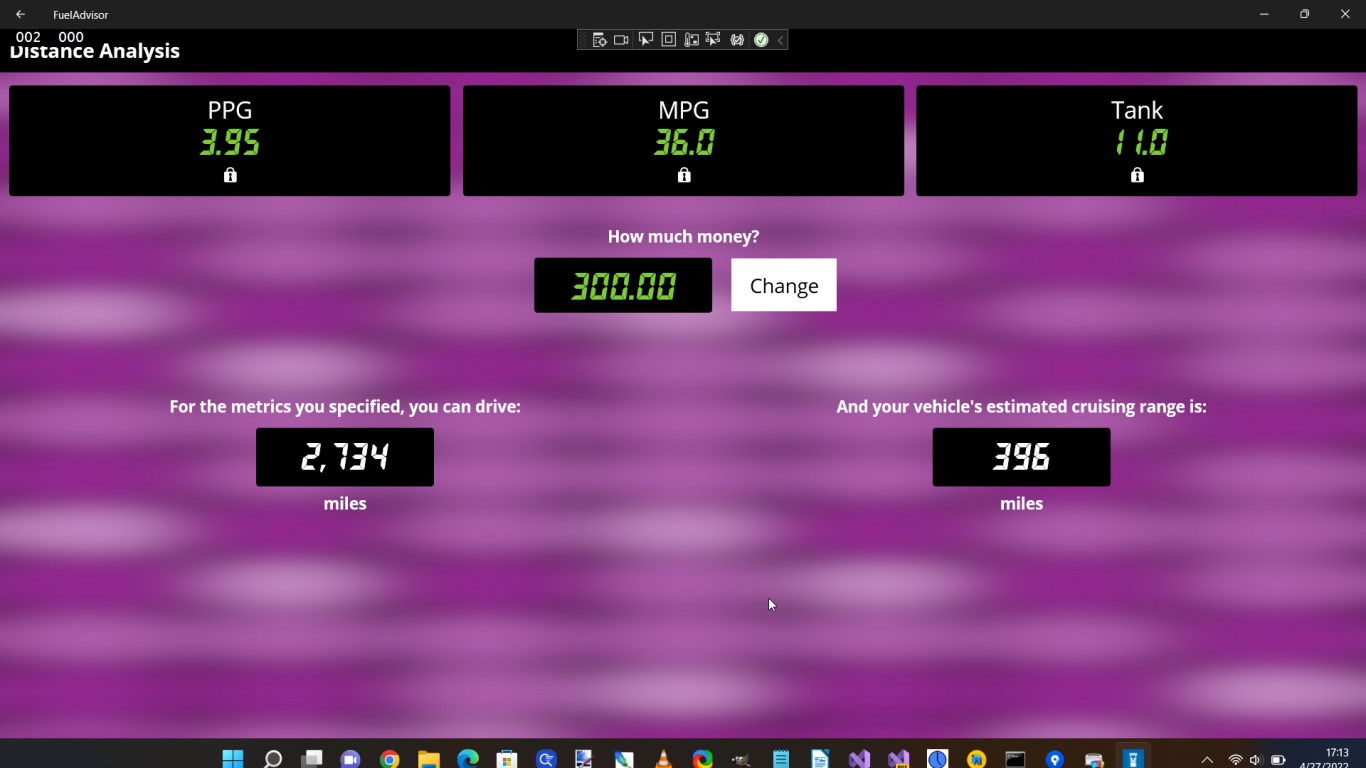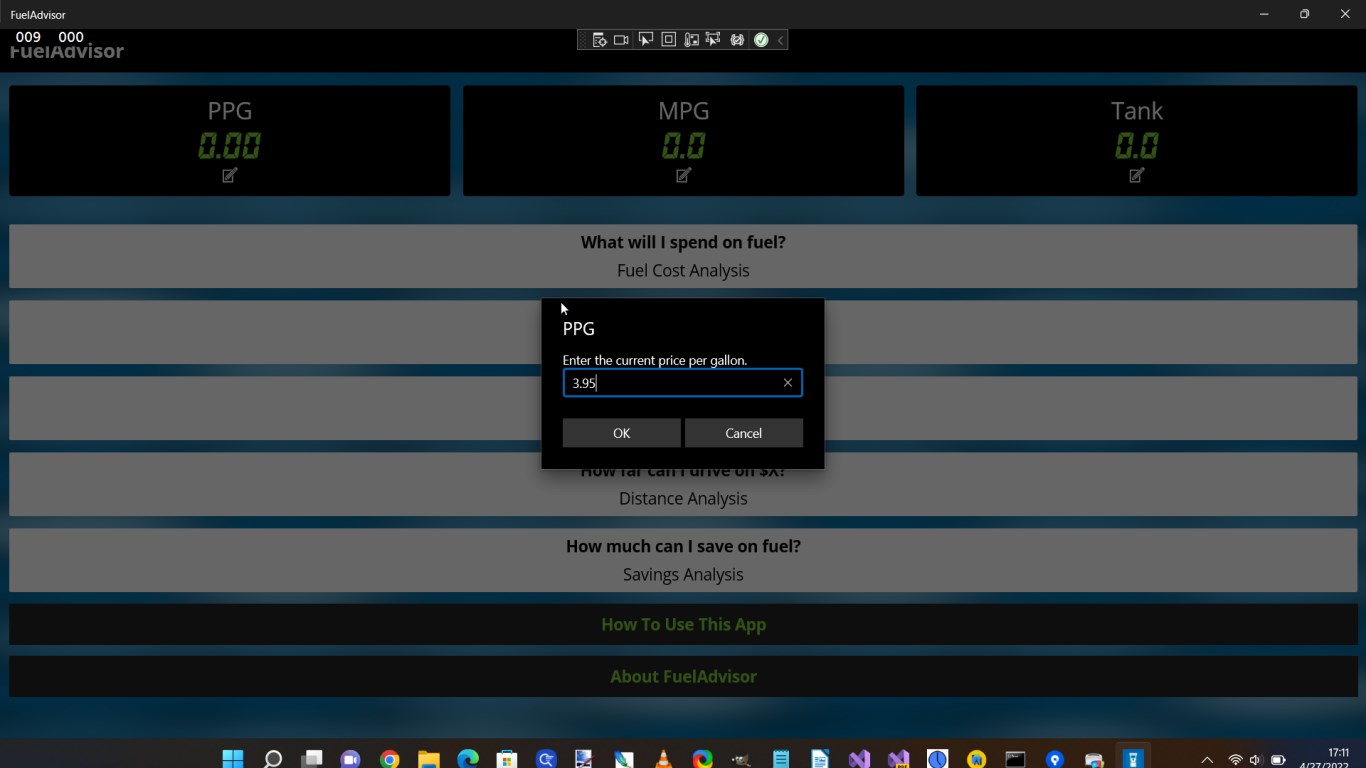 Easy to use! Enter the price of gas from your preferred filling station, along with your vehicle\'s MPG rating and fuel tank size in gallons, and FuelAdvisor crunches the numbers.Fuel Cost Analysis calculates gas expenses for time frames ranging from a week to a month.Trip Cost Analysis calculates how much you can expect to spend to drive a specified number of miles.Fill-Up Cost Analysis calculates how much a full or half fill-up costs.Distance Analysis calculates how far you can drive for a certain amount of money.And Savings Analysis calculates the cost savings for two prices of fuel at different stations, or cash vs. credit.