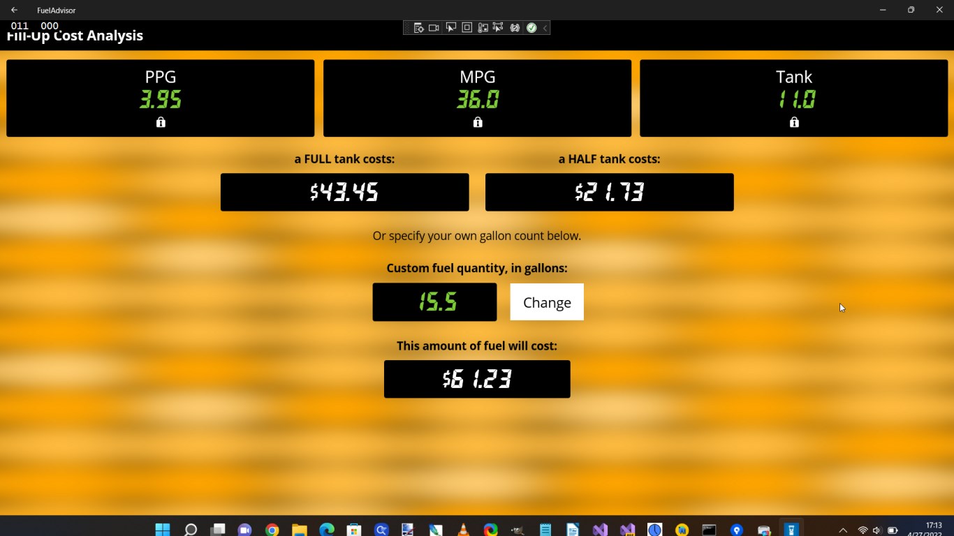 ● How much a fill-up (or a half fill-up) of gas will cost you, or how much it will cost for any number of gallons you’re curious about, perhaps on a rental vehicle