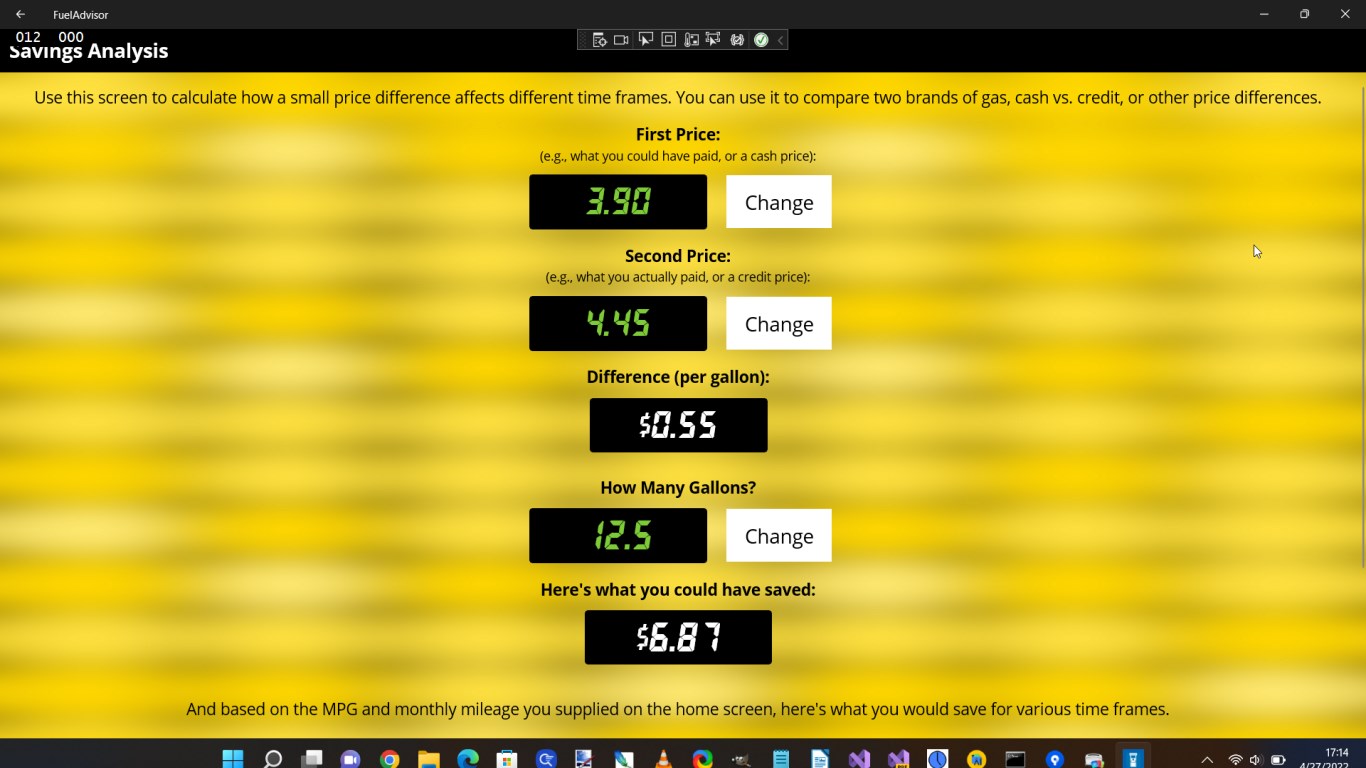 ● How much you can save on gas by comparing two different prices (e.g., cash vs credit, one brand vs another), and what you can save for time frames ranging from a week to a month