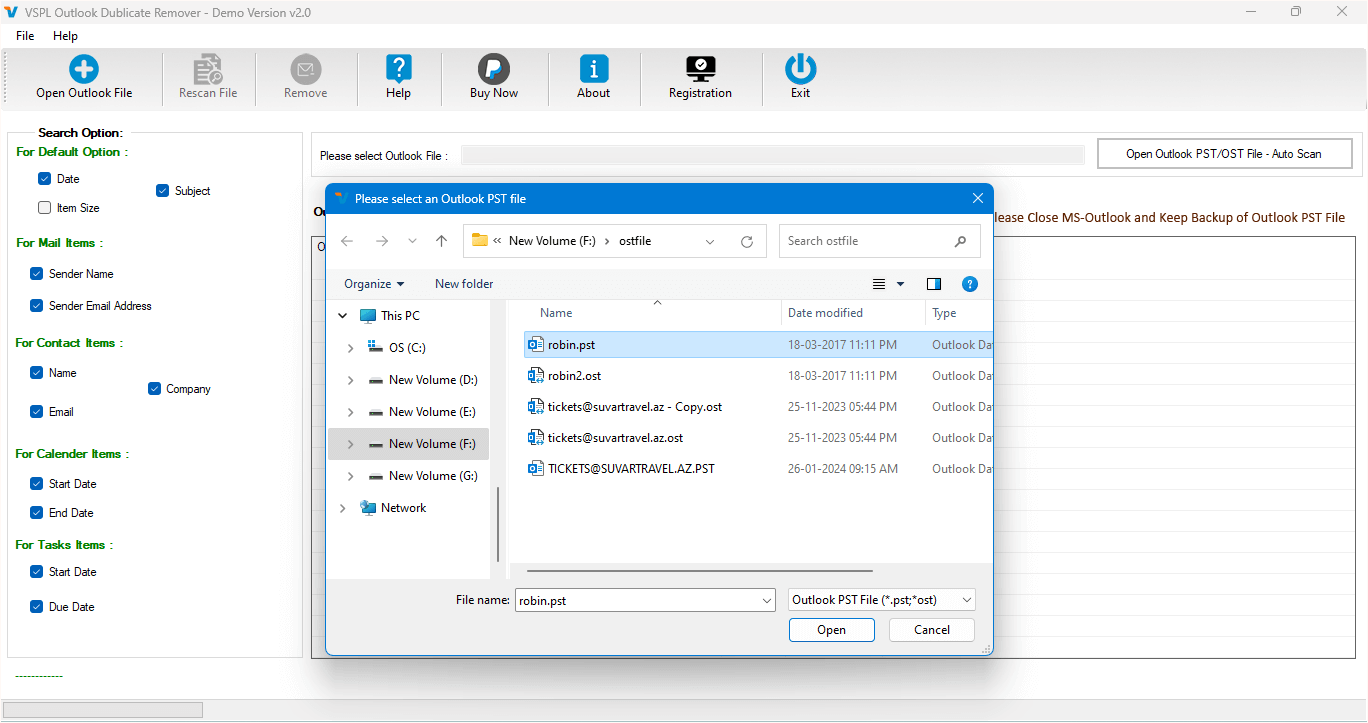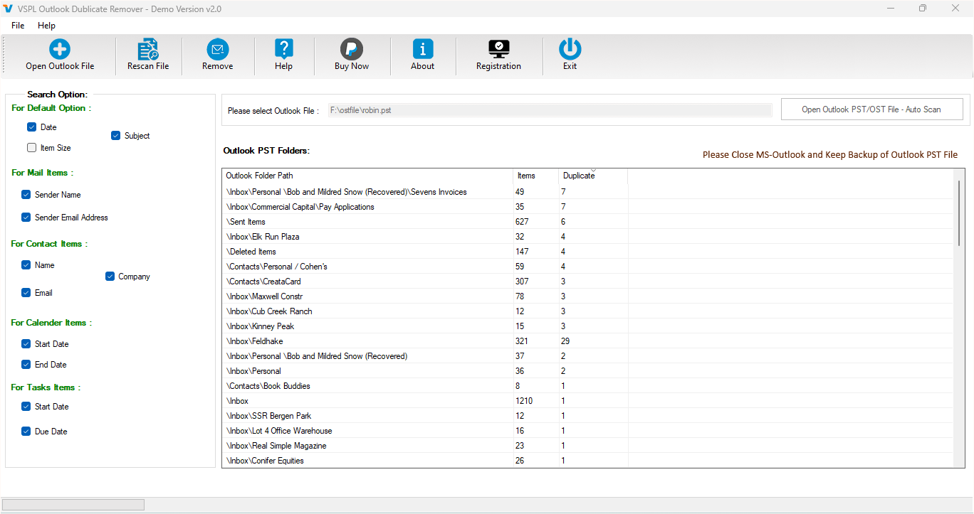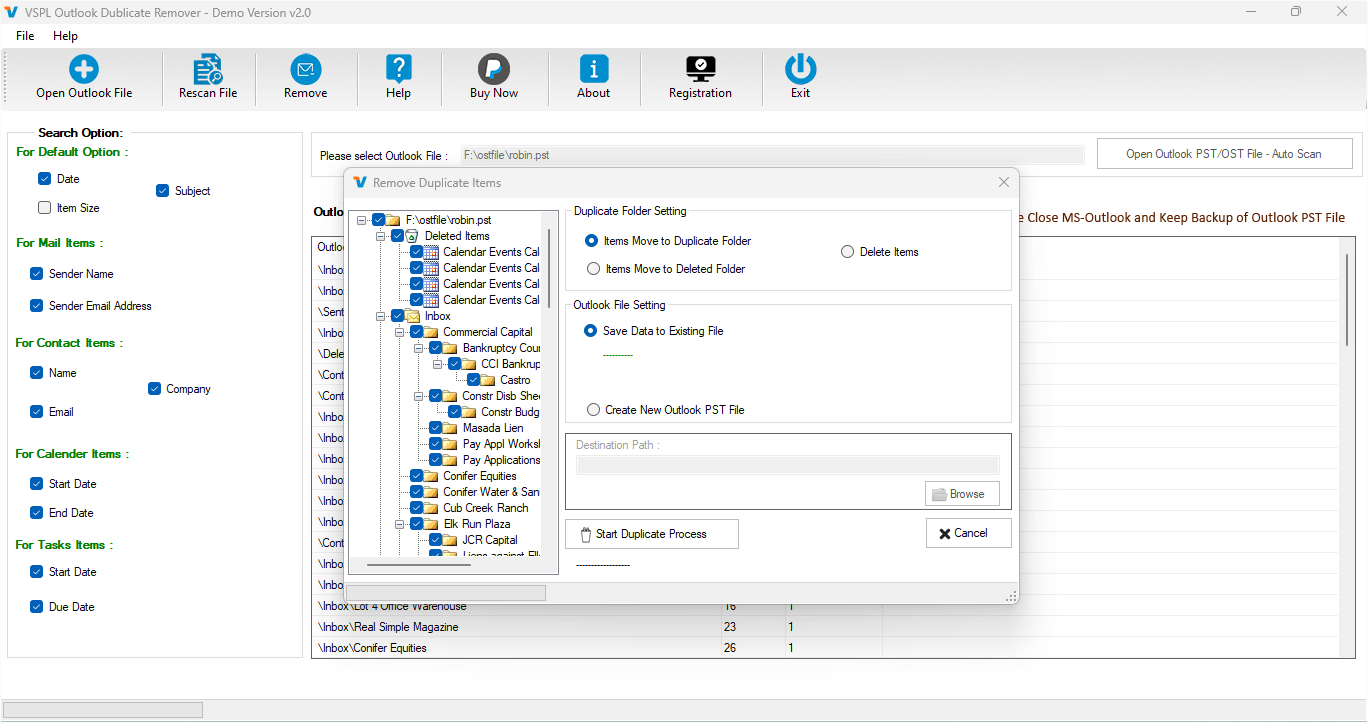 VSPL PST Duplicate Email Remover Software simplifies removing duplicate emails from Outlook PST File. It is the best Outlook duplicate items remover tool that supports extracting selective single and multiple PST File items at the same time. It will remove duplicate items from PST Contacts, calendars, tasks, notes, inbox items, outbox items journals, etc. The software supports all MS Outlook versions and previous versions without problem.