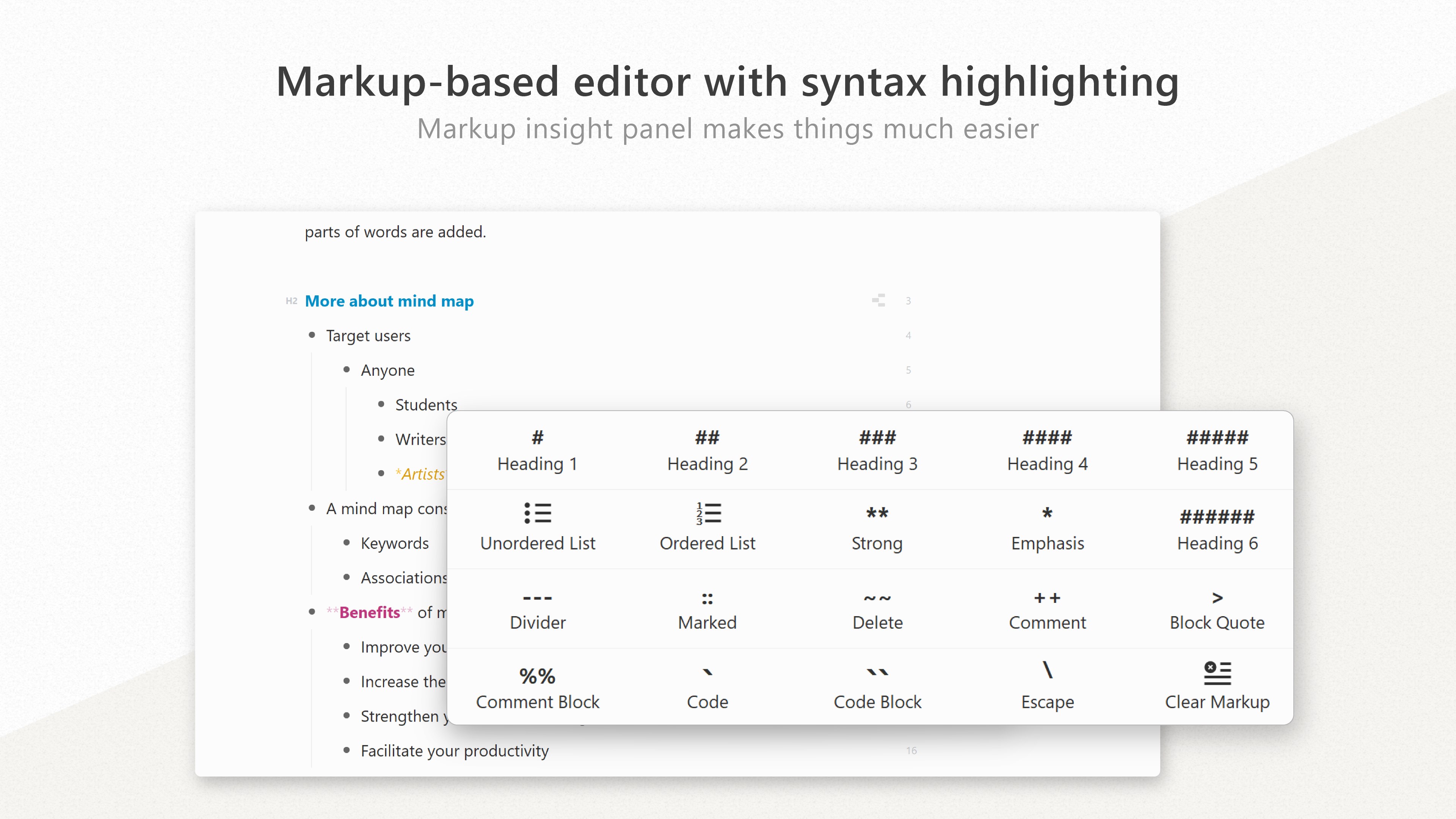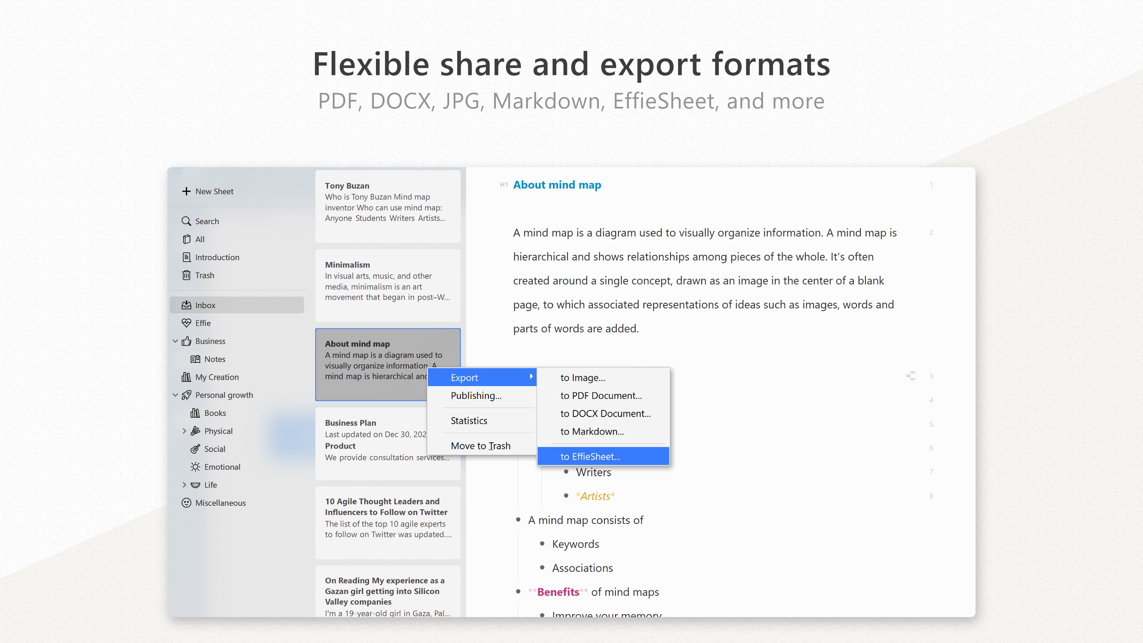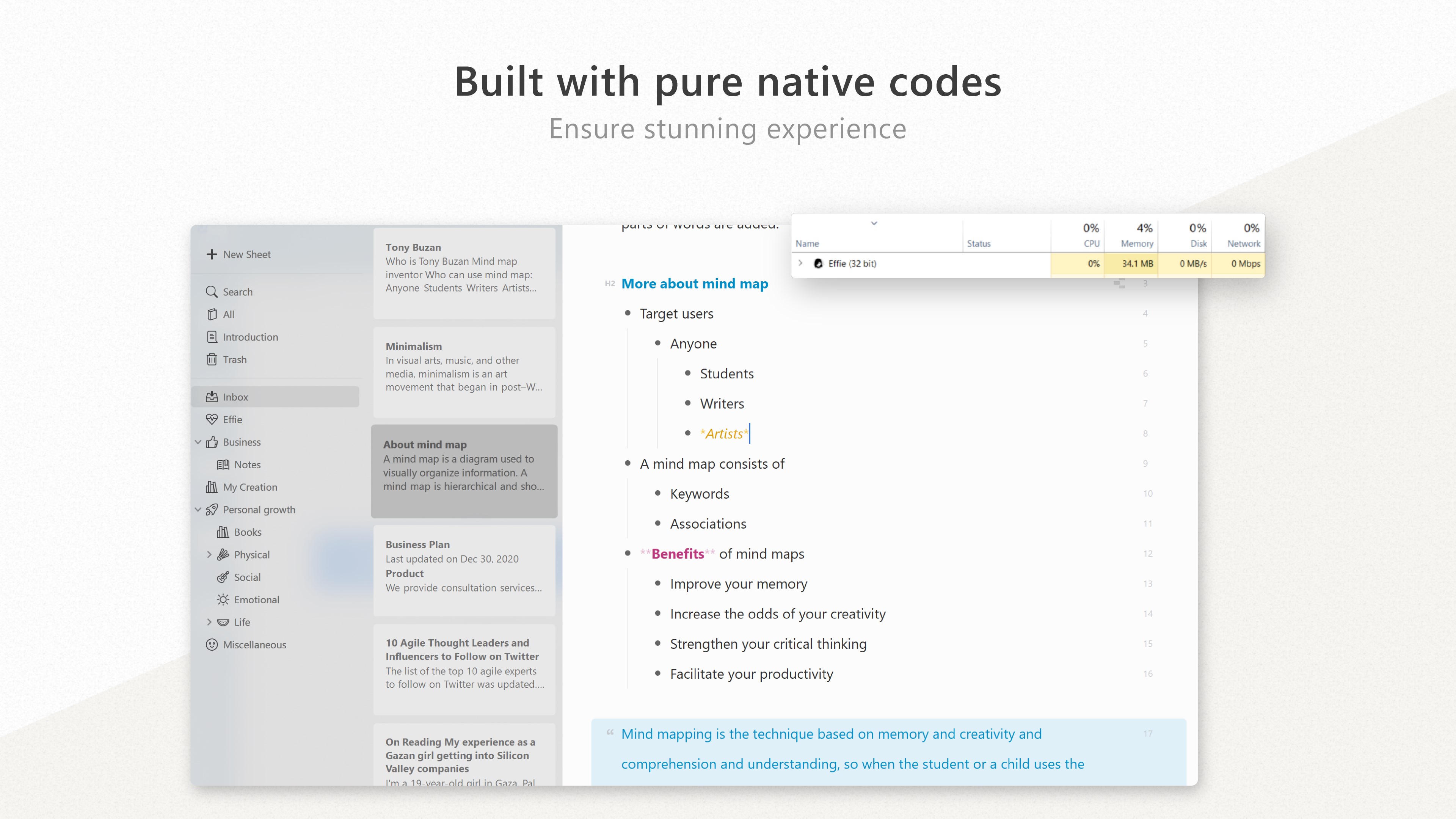 A library that holds everything you ever write, so no more head-scratching file management.All your work is saved and sync in the cloud, so you can access anything from anywhere.An immersive writing environment to keep you away from distractions.One tap to convert an outline into a mind map, and vice versa.Edits on the outline will be synced with a mind map, saving you from jumping the hoops from one app to another.Insert images to your sheets and lists.Flexible export to a PDF, DOCX, Markdown, EffieSheet, and/or JPEG file, which looks awesome when checked on the phone.Simplified markup language allows you to finish your writing without even lifting your fingers away from the keyboard.You can choose to write in the dark or light theme, whichever drives your creativity and productivity.Different styles are available for your mind maps: Fishbones, Logic Chart, Matrix, Timeline, and Org Chart.Publish your work to WordPress directly from within the program.Built with native codes, so it occupies less system resources than you\'d think.