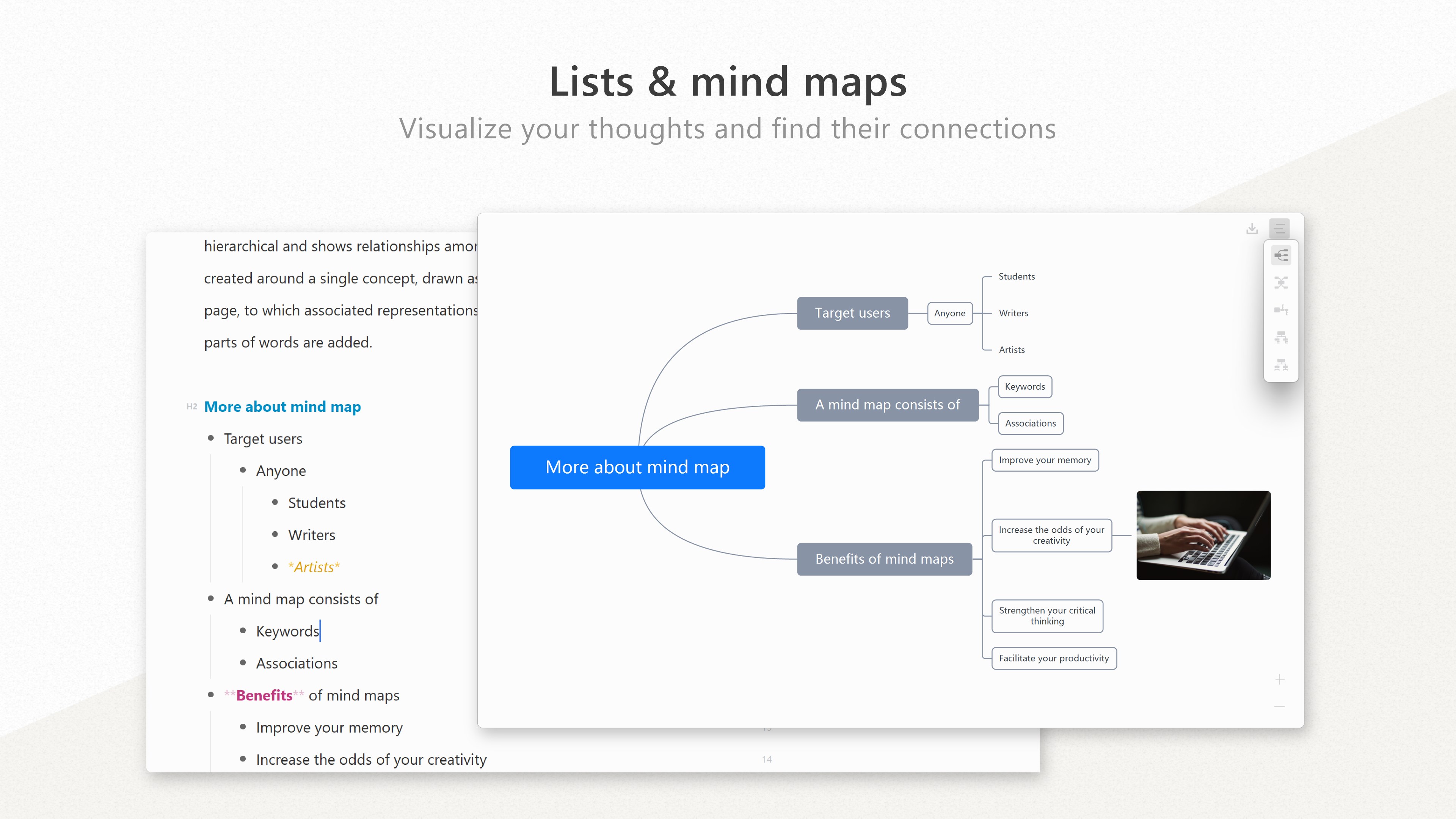 Your brain likes associations. So to turn your great ideas and thoughts into brilliant writing, you need to visualize them, keep them organized, and find logical connections. That's why you can create mind maps in Effie even when writing. With the mind mapping feature, we help to bring your ideas to life.