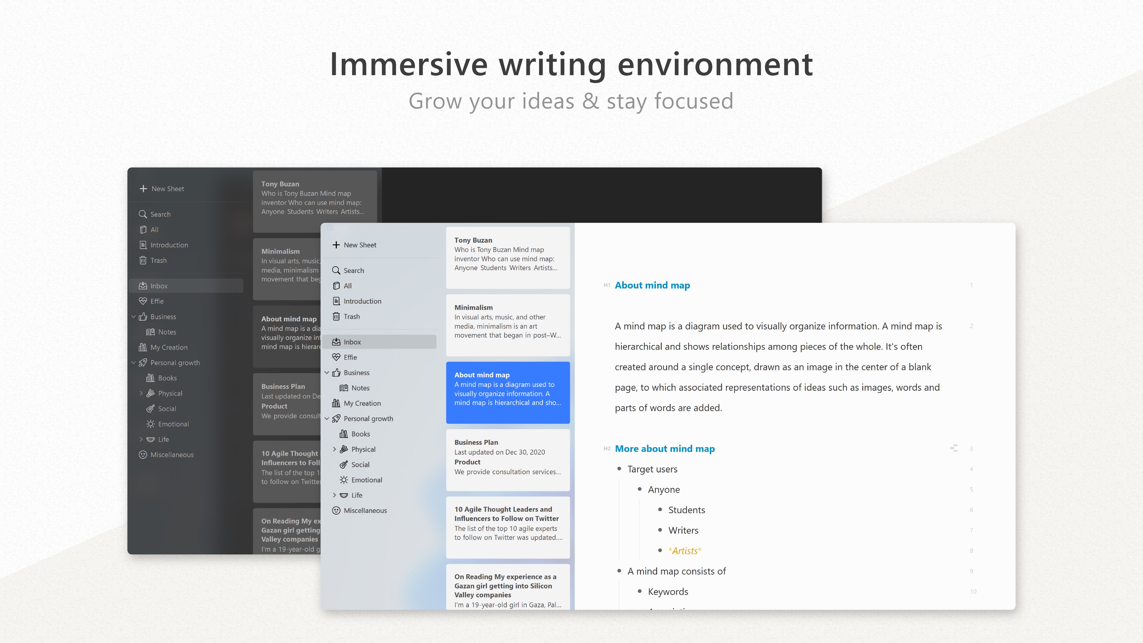 Whether you're planning to write or are writing, Effie is ready to help: you organize your thoughts with mind maps, then expand them in the editor. When you have another light bulb moment when writing, just one click, and you're back in the mind map to note them down. All changes are synced automatically between the mind map and the editor. So you can see the forest and the trees when writing.