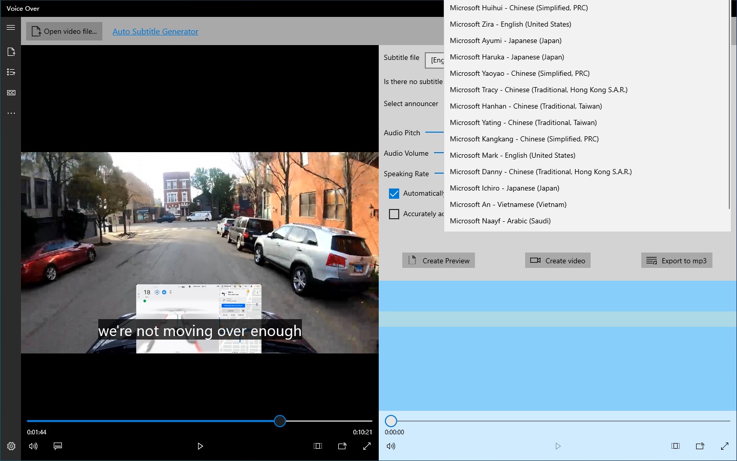 We have developed the voice over App, which includes complete functions --- You only need to open the video and subtitle files, select an announcer, and voice over will automatically generate a voice over for your video, and synthesize the voice over to the video.