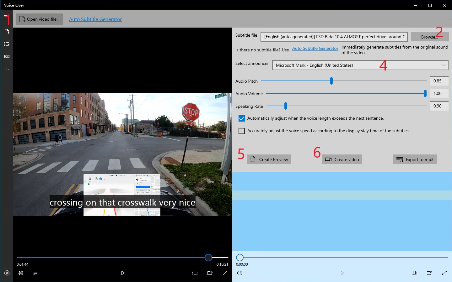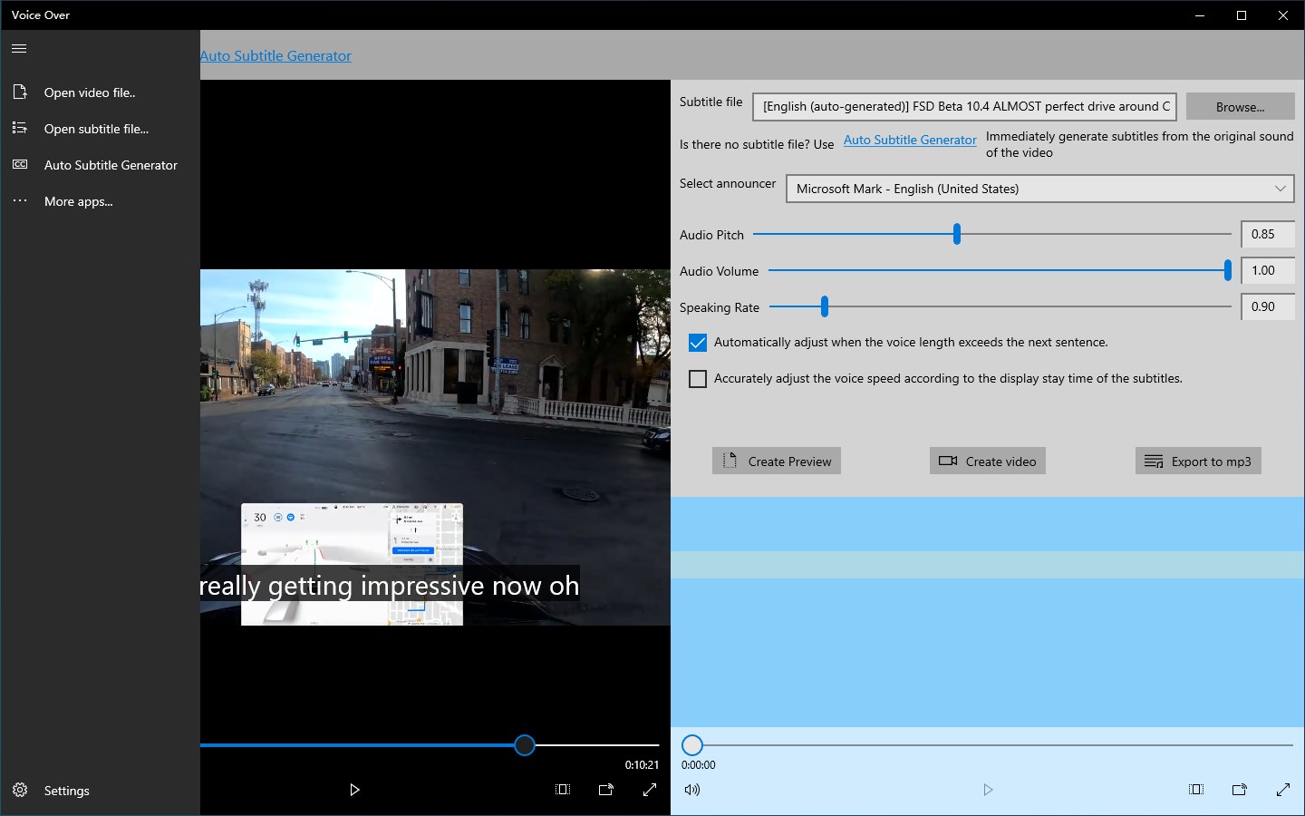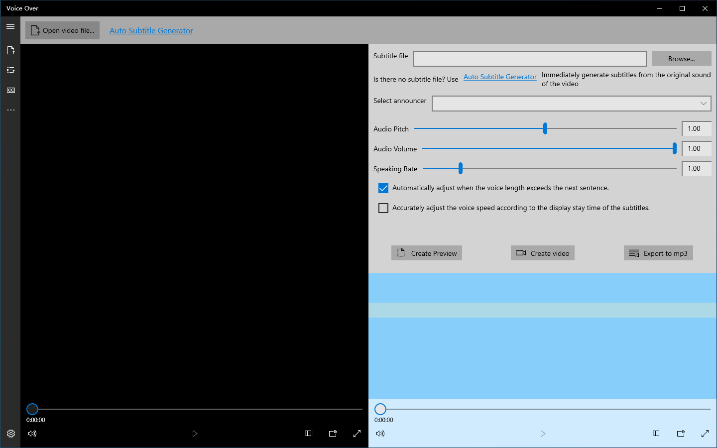 Text to speech via subtitlesAnnouncer selectionAudio pitch adjustmentAudio speaking rate adjustmentDubbing and synthesizing to videoAudio export to mp3