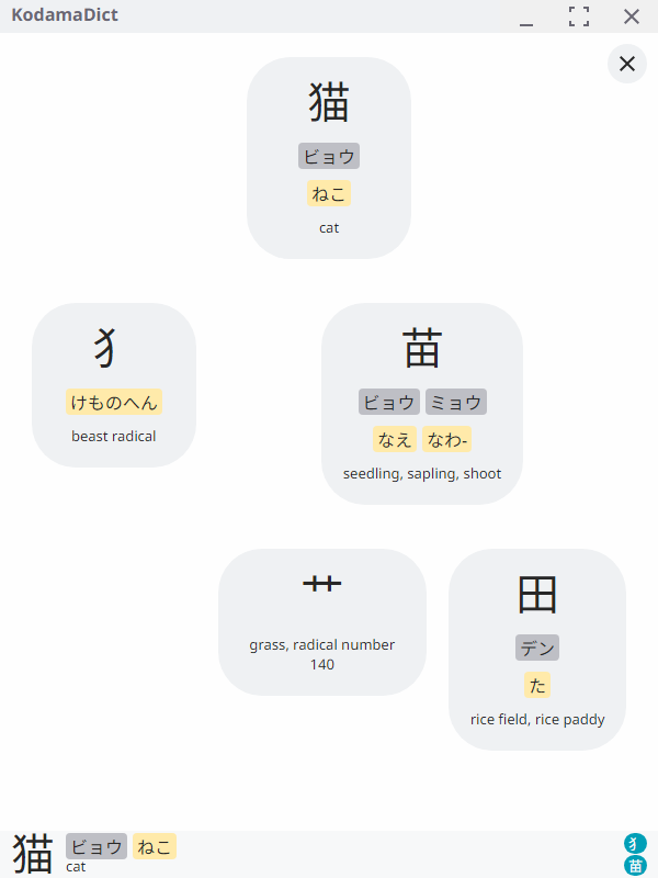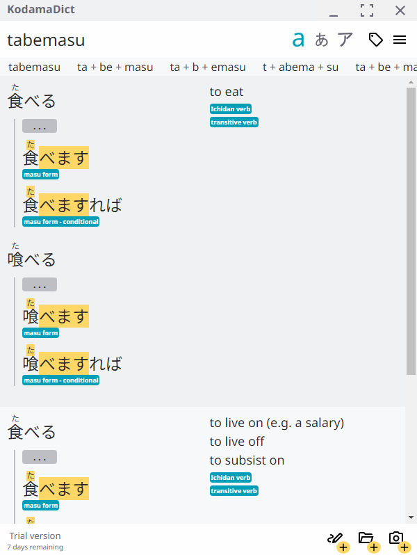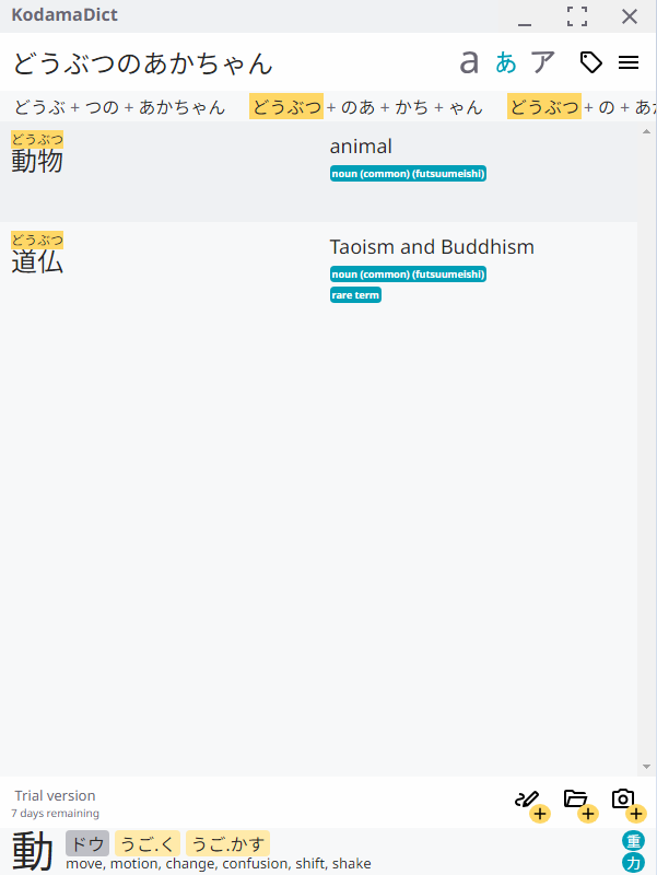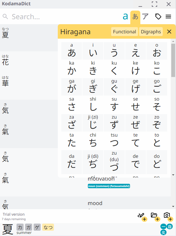 instant search-as-you-typecompletely offline (no internet connection required)search results are ordered based on usage frequencysearch in Romaji, Hiragana, Katakana, Kanji - whatever you preferKanji drawing toolOCR - import file or snap a photoKana tablessearch and explore verb conjugations and adjective formsCategories - words have categories (so you know instantly if you\’re dealing with an adjective, adverb, noun, verb…)Tokenization - in case you don\’t know where the word starts and ends, you can write it all and explore possibilitiesFurigana always above Kanjiparts of words that match your query are highlightedmultiple tabs of drawings and OCR can be opened and it\’s possible to switch between themWikidata integration