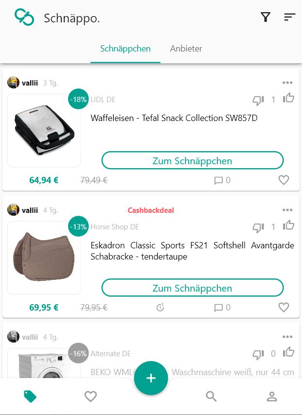 Werde jetzt Teil der Schnäppo-Community. Profitiere von anderen, spare Geld bei deinen Einkäufen und sammle Cashback indem du Schnäppchen von unseren tollen Partnern wahrnimmst oder einstellst.