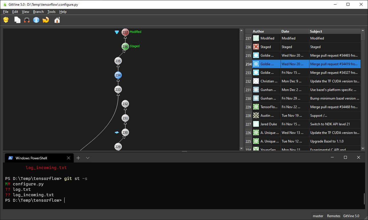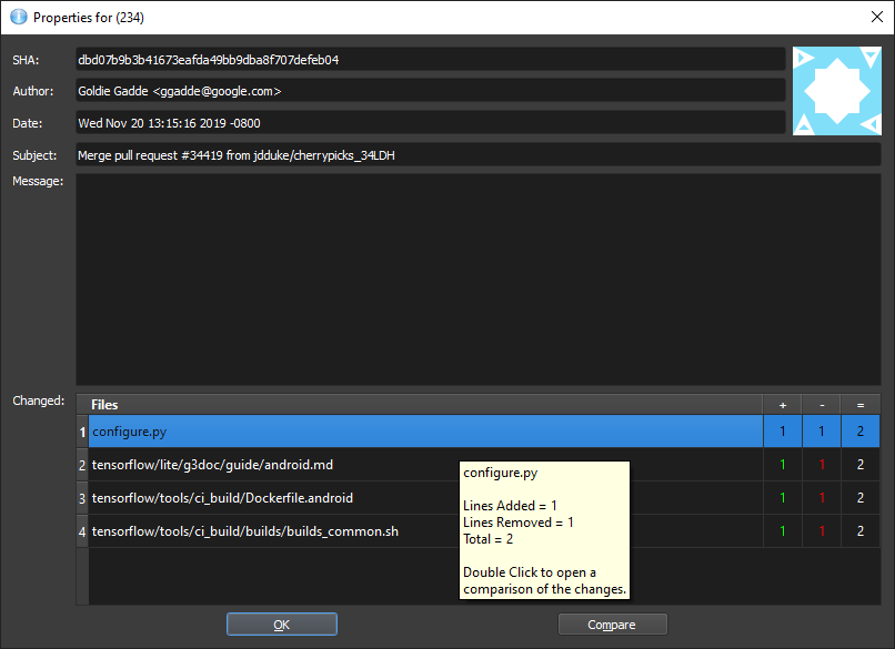 Shows a File\'s Commit Tree and also Folder/Repository.Quick Way to Compare, locate & find commits. Via Right Click / Context Menu.Comparison executes your Git difftool configured on your system.Also supports common modifications: Stage, Unstage, Discard, Commit, Push etc.Easy way to Squash & Amend Commits.Visual Indicators of a Pending Push, (file) Head etc.Configurable: Ascending/Descending Tree, Dark Mode etc.Integrated Terminal for full manual control. (On Windows & Linux. Limitations on macOS.) Find Changes on any Branch quickly.Crossplatform: Windows, Linux & macOS.