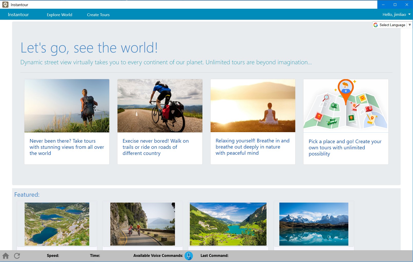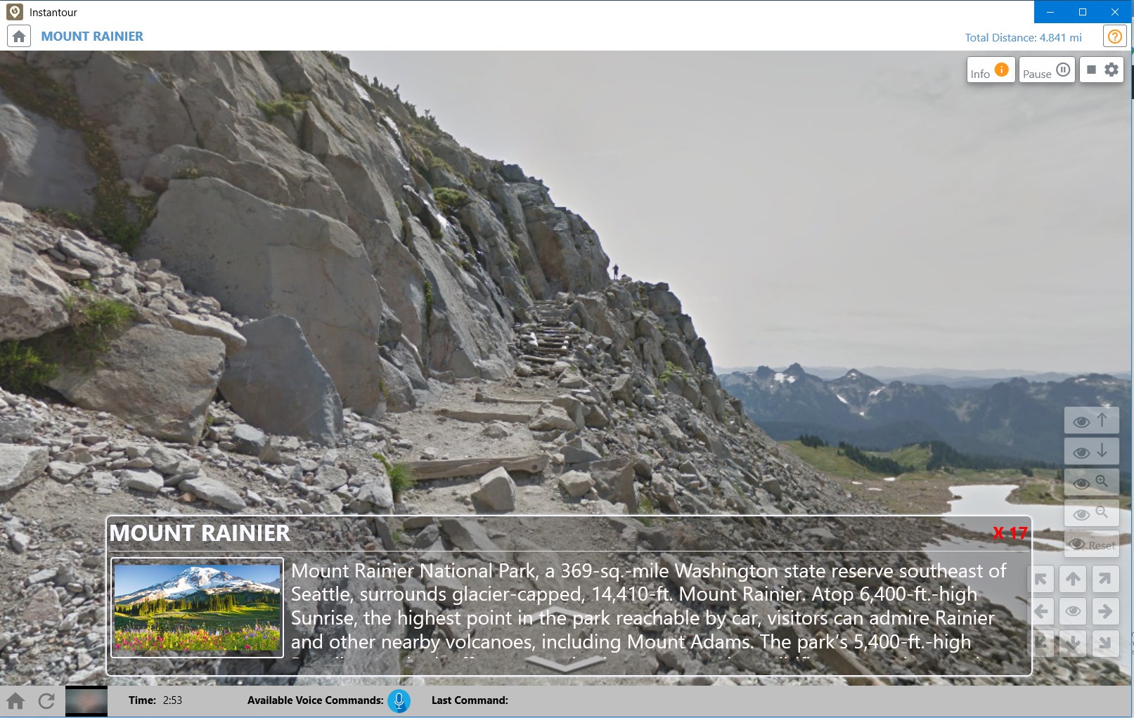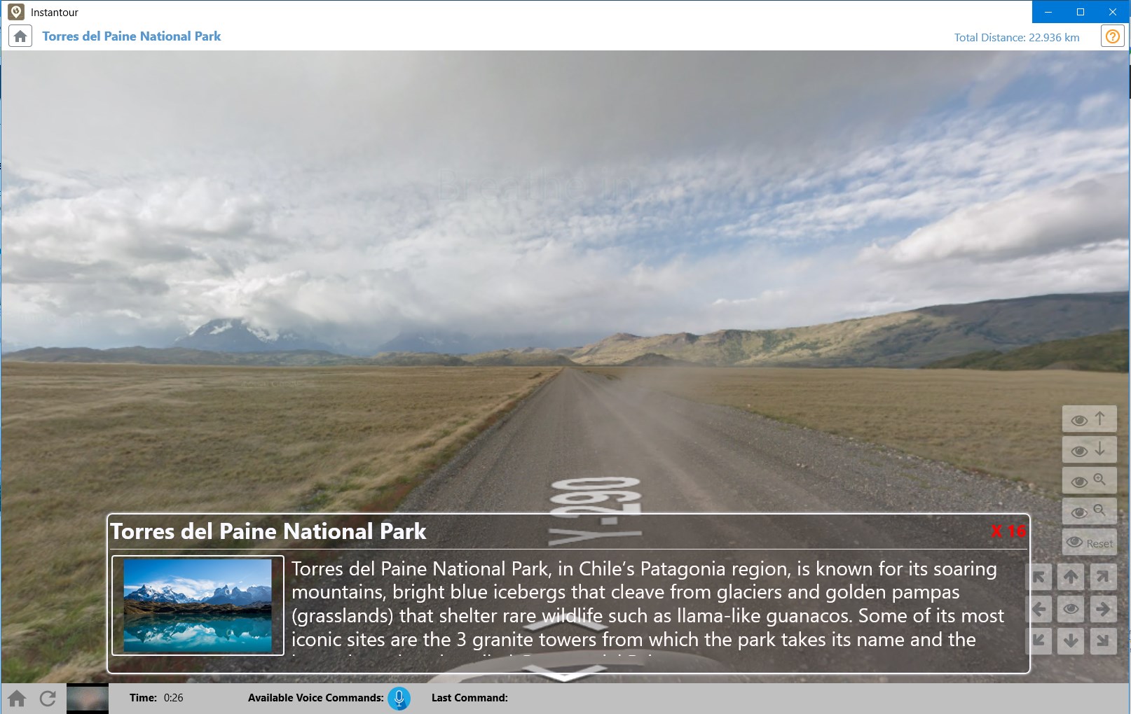 Users can change view direction during the tour, such as look left, right, front, back, etc.The application can detect user body movement and speed while users exercise on a treadmill or stationary bike.Users can ask watched information at view direction. Support Voice command for different operations. Such as \“What is that?\”, \“Please Pause\” etc.