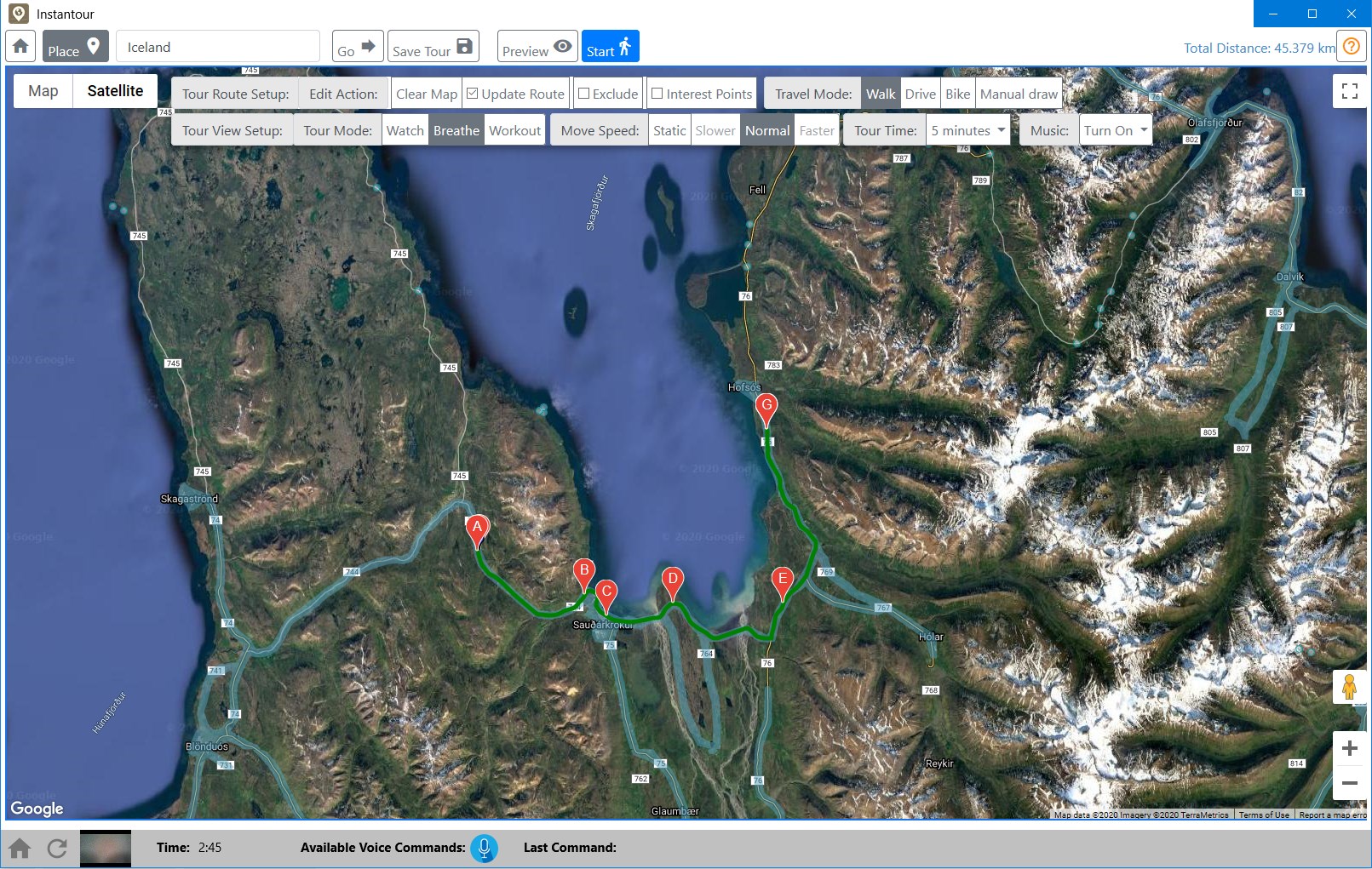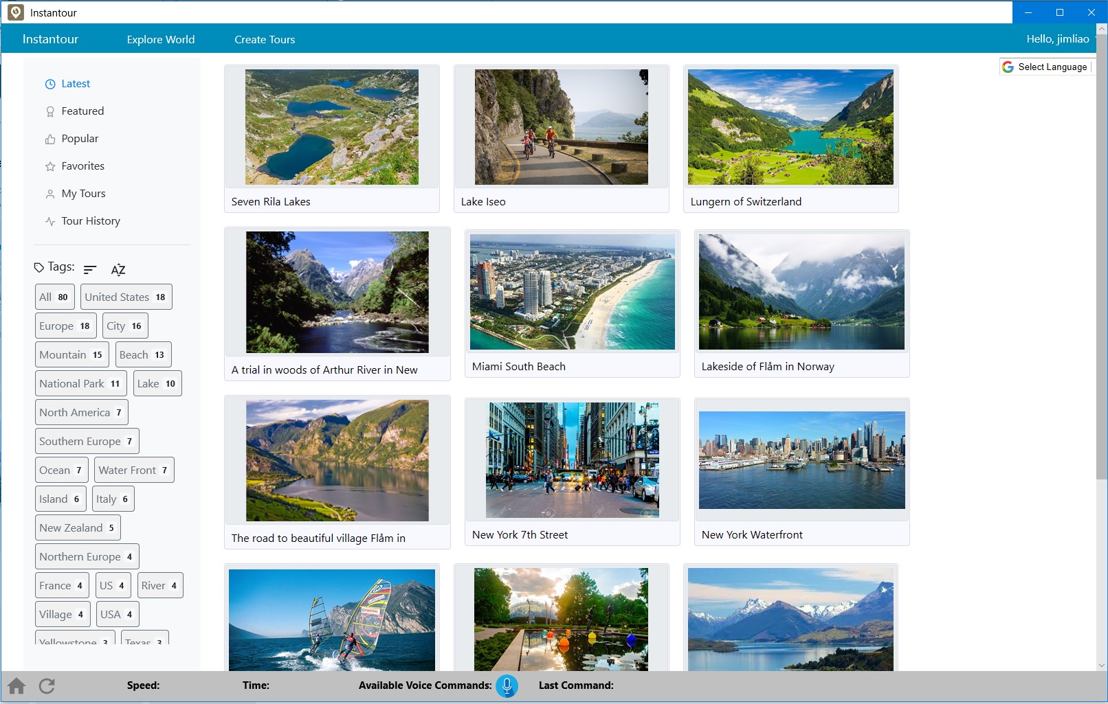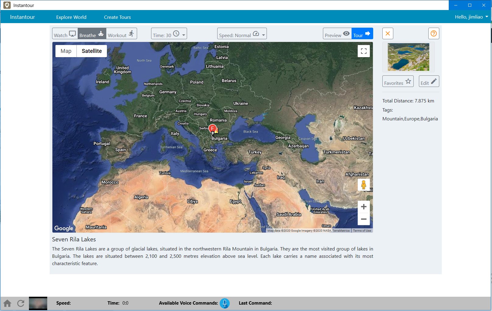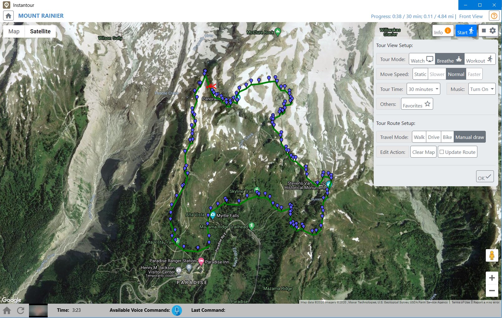 Users can change view direction during the tour, such as look left, right, front, back, etc.The application can detect user body movement and speed while users exercise on a treadmill or stationary bike.Users can ask watched information at view direction. Support Voice command for different operations. Such as \“What is that?\”, \“Please Pause\” etc.