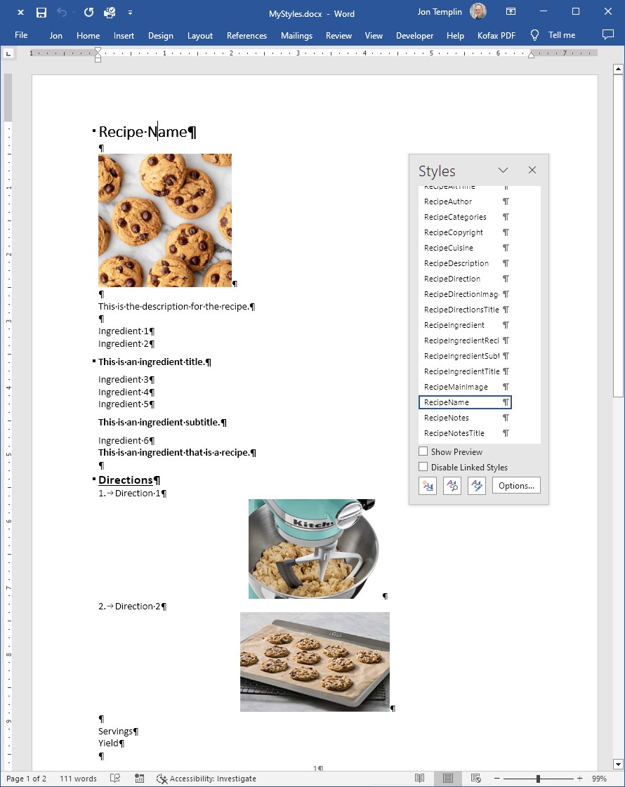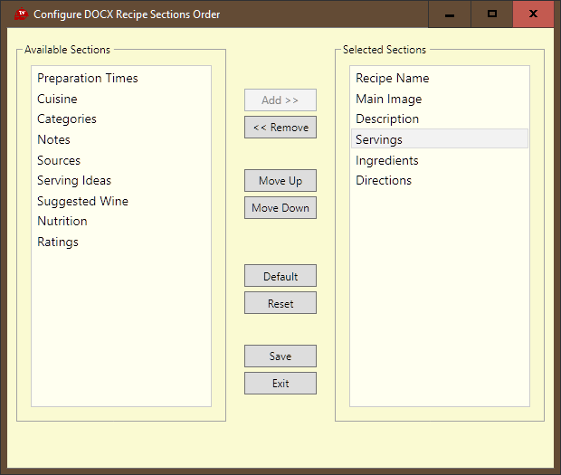 The default formatting options produce very attractive Word documents which may be fine for many users. However, if you want more control over the formatting, click the User Guide button in the app for detailed instructions on how to do this. You can change which recipe sections appear and their order. If you have Word installed on your PC, you can also modify the styles used when formatting the sections.