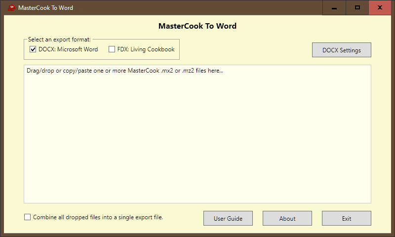 Very easy to use! Simply drag/drop (or copy/paste) as many MasterCook recipe files as you want into the main program window. The recipe files you drop may contain one or more recipes. A Microsoft Word document is created from each dropped file.
