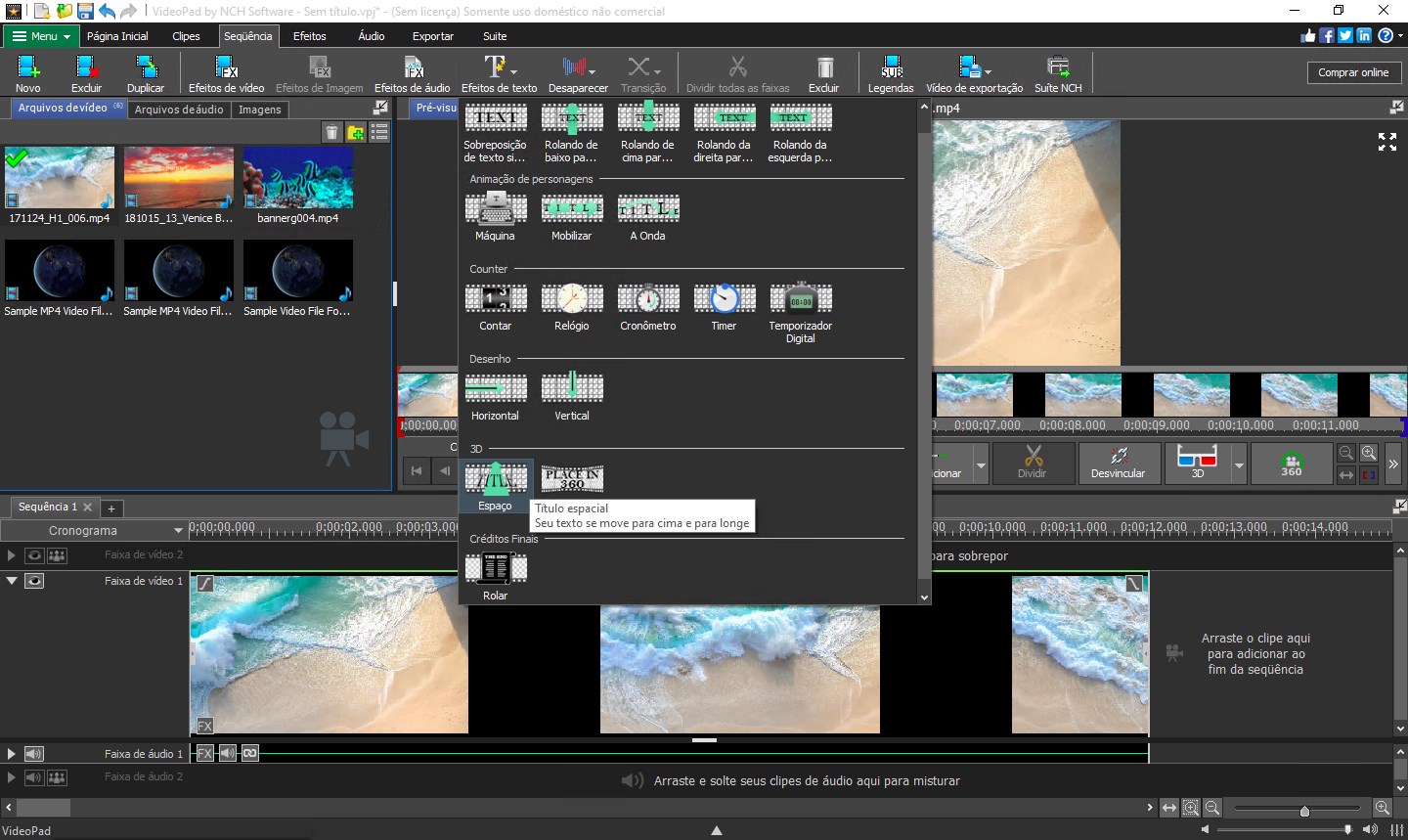 Arraste e solte arquivosUse uma grande variedade de tipos de arquivos de vídeo e áudioA interface intuitiva do VideoPad permite que você vá direto para a ediçãoGrave áudio e vídeo para editarCrie modelos de efeitos visuais para qualquer projetoSuporte a plug-ins para adicionar ferramentas e efeitosAltere a velocidade dos seus clipes ou inverta-osTexto de sobreposição para títulos, legendas ou créditos do filmeMelhore a qualidade do vídeo com estabilização de vídeo e correção de corTransição perfeita de clipe para clipeEnvie para o YouTube, Facebook e muito maisGravar em DVDEdição de vídeo 3D